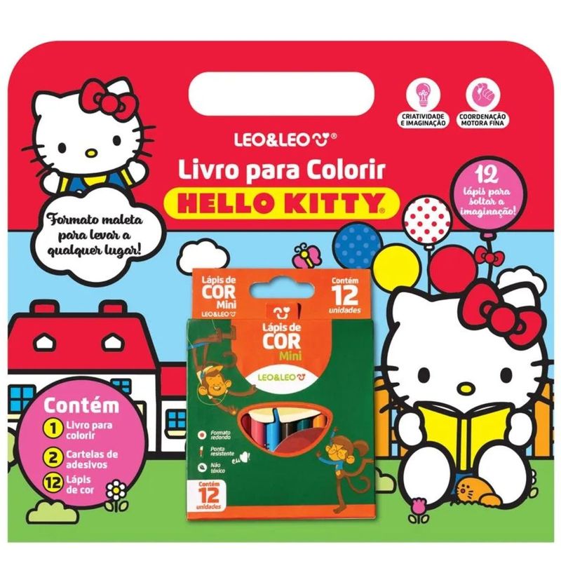 Livro Para Colorir Hello Kitty - Shrink C/ Livro + Cartela De Adesivos + Lápis De Cor Leo&Leo A diversão e a imaginação ganham novas páginas na vida da criança com o Livro Para Colorir Hello Kitty - Shrink com Livro + Cartela de Adesivos + Lápis de Cor Leo&Leo. Ele é um livro com 16 ilustrações adoráveis para colorir e divertir, e todas elas com a temática da personagem mais fofa que existe, Hello Kitty, em cenários incríveis. Acompanha também duas cartelas com 76 encantadores adesivos. Inclui uma caixa com 12 lápis de cor mini Leo&Leo, perfeitos para dar vida às criações e ainda personalizar o livro como a criança imagina. Seu formato maleta é perfeito para carregar para qualquer lugar, seja para colégio, casa dos amiguinhos, na visita à vovó ou onde quiser! Além de estimular a expressão artística, ele desenvolve a imaginação e a criatividade, a coordenação motora fina, e ainda melhora o foco e a concentração. O Livro Para Colorir Hello Kitty + Cartela de Adesivos + Lápis de Cor Leo&Leo é ideal para atividades criativas em casa e na escola, sendo recomendado para crianças a partir de 3 anos, e uma excelente opção como presente. FICHA TÉCNICA:Contém Livro para colorir com 16 ilustraçõesAcompanha duas cartelas com 76 adesivos totalInclui 1 caixa com 12 lápis de cor miniCapa: papel supremo imune 250gVerniz base d'água brilhoMiolo: papel offset imune 90g e papel couchê adesivo brilho 190gContém artigo escolar certificado no âmbito do Sistema Brasileiro de Avaliação da Conformidade