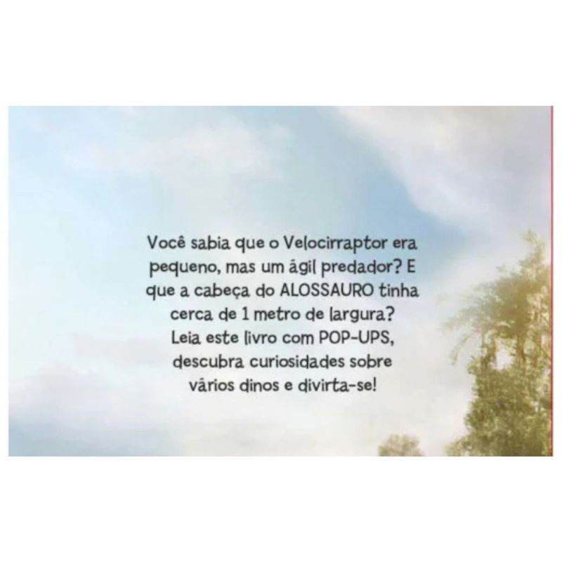 LIVRO DINOSSAUROS - POP-UPS DIVERTIDOS - CIRANDA CULTURAL Você sabia que o Velocirraptor era pequeno, mas um ágil predador? E que a cabeça do Alossauro tinha cerca de 1 m de largura? Leia este livro com pop-ups, descubra curiosidades sobre vários dinos e divirta-se!Editora: Ciranda CulturalEdição: 1, 2021Autor: Jamille GentileIlustrador: Federico CombiIdioma: PortuguêsPáginas: 10Dimensões: L 19.50 x A 19.80 x E 1.50ISBN: 9786555007275Coleção: Pop-ups divertidosLinha Editorial: Ciranda Cultural - Ficção infantilFaixa Etária: + 4 anosAssuntos (tags): Dinossauro, Textos informativos, Curiosidade, Diversão, Aventura, AprendizadoBISAC: Literatura Infantil / Animais / Dinossauros & Criaturas Pré-HistóricasLinha de Produto: Pop-upEncadernação: Lombada quadradaAcabamento: AlmofadadaMaterial: Papel
