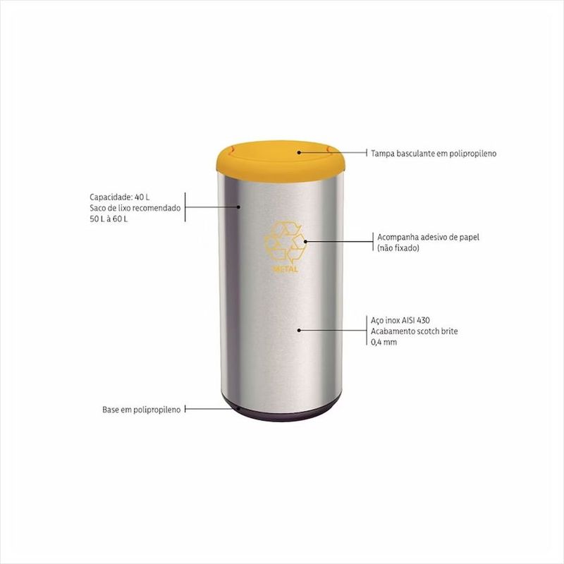 Lixeira Inox Cápsula Selecta Plus Basculante 40 Litros TramontinaOrganização e sustentabilidade aliadas ao design eleganteA Lixeira Inox Cápsula Selecta Plus Basculante 40 Litros Tramontina é a solução perfeita para manter seu ambiente limpo e organizado. Com design moderno e funcional, é ideal para uso em ambientes domésticos, comerciais ou de grande circulação de pessoas como escolas, restaurantes e empresas. Além disso, facilita a prática da coleta seletiva, contribuindo para a preservação do meio ambiente.Seu acabamento Scotch Brite confere durabilidade e resistência à lixeira, enquanto a tampa basculante em polipropileno na cor amarela indica o descarte correto de materiais recicláveis, como metais. Com capacidade para 40 litros, garante espaço suficiente para o armazenamento adequado dos resíduos, mantendo o ambiente sempre limpo e organizado.Diferenciais:Design moderno e eleganteResistente e durávelIndicada para uso doméstico e comercialIdeal para coleta seletivaCapacidade de 40 litrosMais sobre o Produto:Acabamento Scotch Brite para maior durabilidadeTampa basculante em polipropileno na cor amarela para facilitar a separação de materiais recicláveisDesign moderno que se adapta a diversos ambientesFácil de limpar e manterDicas de Uso:Para otimizar o uso da Lixeira Inox Cápsula Selecta Plus Basculante 40 Litros Tramontina, posicione-a em locais estratégicos de fácil acesso e visibilidade. Utilize sacos de lixo adequados ao tamanho da lixeira para facilitar a limpeza e troca do recipiente. Lembre-se de realizar a coleta seletiva conforme as cores indicadas na tampa, contribuindo assim para o cuidado com o meio ambiente.Ficha Técnica:Marca: TramontinaMaterial: Aço Inox e PolipropilenoCapacidade: 40 LitrosCor: AmarelaDimensões: 40 cm (diâmetro) x 66 cm (altura)