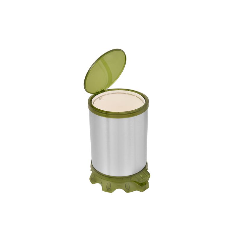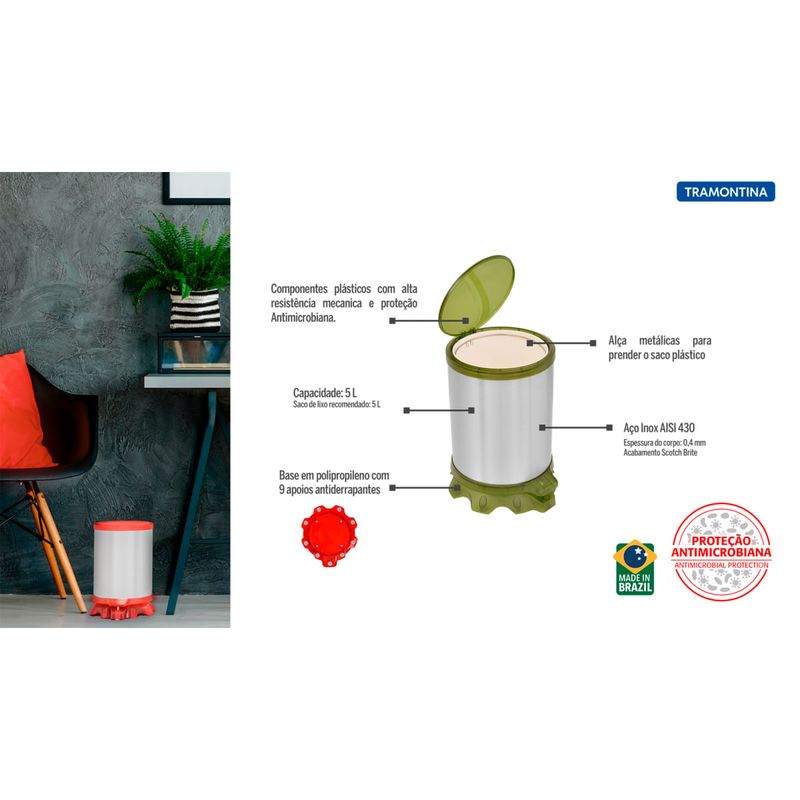A Lixeira Inox com Pedal Tramontina Sofie 5 L com corpo com acabamento Scoth Brite e componentes plásticos verdes é uma peça essencial para o conforto e decoração da sua casa. Fabricada no Brasil, é produzida em aço inox com acabamento acetinado. Possui capacidade de 5 L. Com um mecanismo interno diferenciado onde todo o cilindro se abaixa ao pressionar o pedal, permitindo dessa forma que a tampa, articulada na parte fixa, se abra. Com componentes plásticos coloridos translúcidos e com proteção antimicrobiana fazem da lixeira Sofie um item de decoração, além de desenvolver sua função primordial.