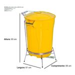 Lixeira Redonda 100l Amarela + Pedal De Aço Desmontável JsnLixeira com pedal de aço desmontável, 100 litros,amarela. Características da Lixeira Cesto redondo com pedal de aço confeccionado em polipropileno e com proteção contra raios UV, UVA, UVB. Não resseca e tem maior durabilidade com camada protetora a cor não desbota com facilidade pode ser usado em todos os tipos de locais onde houver necessidade. Tampa acionada através do pedal, evitando o contato manual. Produzida com material qualificado e de alto impacto. É atóxica e a procedência da matéria prima utilizada lhe confere resistência e durabilidade. Tipo de lixeira: Pedal com aço Características do pedal desmontável Utilização em lixeiras redondas de 100 litros. A armação é confeccionada em aço carbono SAE 1020 galvanizado. Ideal para utilização em residências, consultórios médicos e odontológicos, lanchonetes, cozinhas indústriais, restaurantes, farmácias, postos de saúde, clubes, escolas e universidades. Medidas do cesto com pedal de aço Altura: 83 cm Largura: 61 cm Comprimento:65 cm Embalagem: 1 lixeira com pedal de aço desmontável, 100 litros,amarela..- Sua satisfação garantida. Compre com segurança!Milhares já aprovaram. Seja o próximo!Qualidade comprovada. Adquira o seu sem preocupações... Sua satisfação garantida. Compre com segurança!Milhares já aprovaram. Seja o próximo!Qualidade comprovada. Adquira o seu sem preocupações.