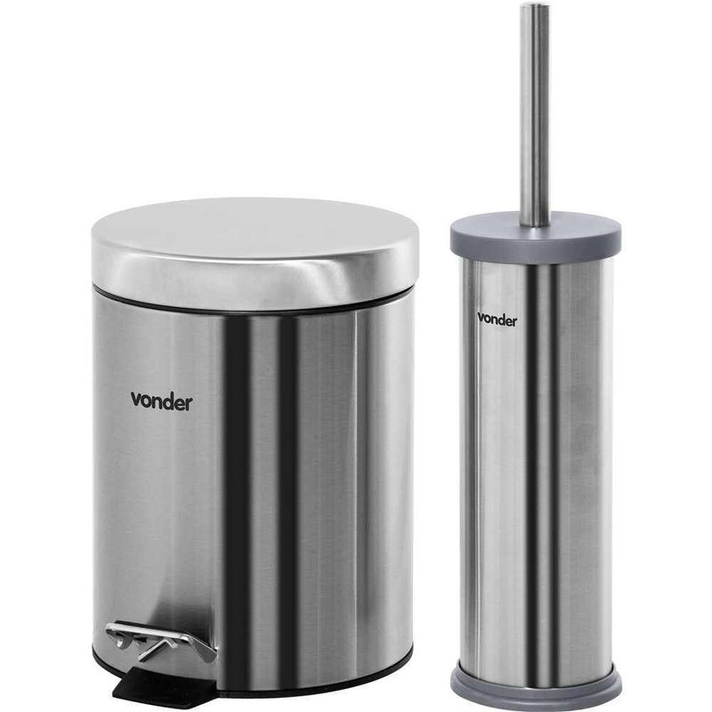 Lixeira Redonda 5l Inox Cinza Com Escova Sanitária VonderConteúdo da Embalagem: 1 lixeira e 1 escova sanitária com suporte.Fabricada em aço inox 410. Possui balde plástico removível com alça e abertura da tampa por pedal, com sistema de amortecimento. Conta ainda com escova sanitária e suporte em aço inox 410 com tampa.Indicada para descarte de resíduos.Garantia legal: 90 diasCapacidade: 5 litrosFormato: RedondoTipo de tampa: Inox, abertura por pedalDimensões: Diâmetro 260 mm / Altura 280 mmCor da lixeira: Cinza (Inox)Material: Aço Inox 410Massa aproximada (peso): 0,92 kg NA
