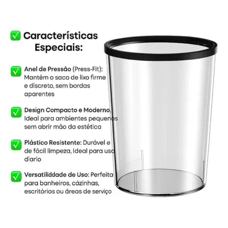 Lixeira Redonda Com Anel De Pressão 10 LitrosLixeira Redonda com Anel de Pressão – 10LIdeal para diversos ambientes:Uso doméstico em cozinhas, banheiros, escritórios ou áreas de serviçoPerfeita para ambientes pequenos e organizadosDesign inteligente e moderno:Formato cilíndrico com anel press-fitEsconde as bordas do saco de lixo – sem pontas aparentesCombina com qualquer estilo de decoraçãoPrática no dia a dia:Fácil de limpar – pano úmido ou sabão neutroPlástico resistente para uso diárioIdeal para descartes leves e regularesEspecificações Técnicas:Capacidade: 10 litrosDimensões: 22 cm (diâmetro) x 18,5 cm (largura do anel) x 27 cm (altura)Peso: 505gCor: TransparenteMaterial: Plástico durávelConteúdo da Embalagem:- 1x Lixeira Redonda com Anel de Pressão – 10L