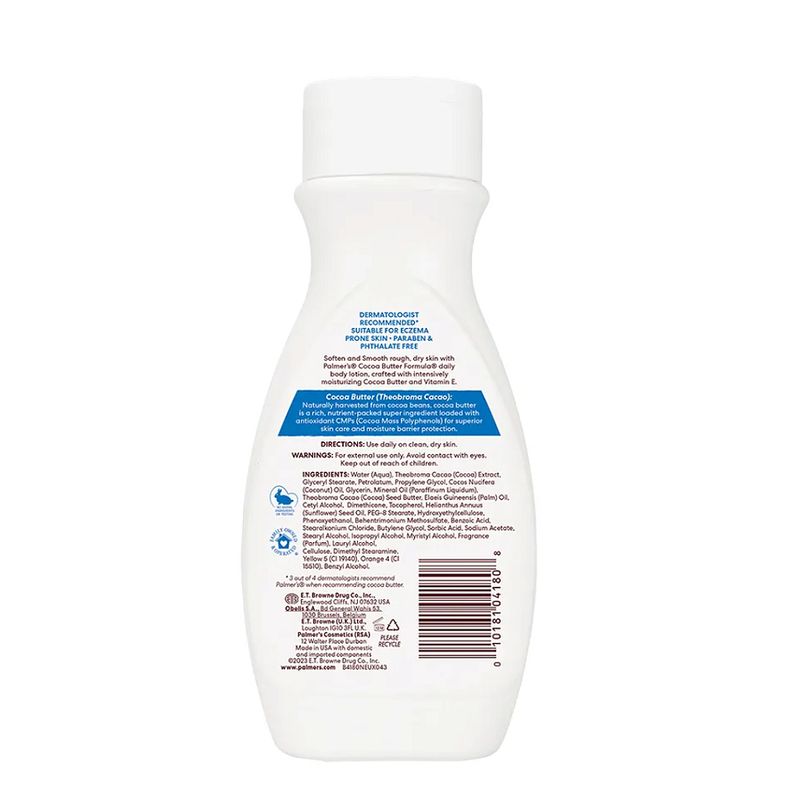 Loção Hidratante 250ml - Palmers Cocoa Butter Formula Com uma composição rica e concentrada, essa loção de rápida absorção para o corpo é o segredo para uma pele sexy! Sinta sua pele macia, suave e mais uniforme logo após a aplicação. Propriedades e benefícios Derrete ao entrar em contato com a pele, sem deixá-la gordurosa; Suaviza marcas e cicatrizes; Feita com vitamina E, um excelente antioxidante que estimula a produção de colágeno e melhora a função protetora da pele, reduzindo a aparência de marcas de expressão, rugas e cicatrizes; A manteiga de cacau evita a perda de elasticidade, melhora a aparência de cicatrizes e hidrata profundamente a pele. Indicação Ideal para todos os tipos de pele. Validade: 03/04/2027