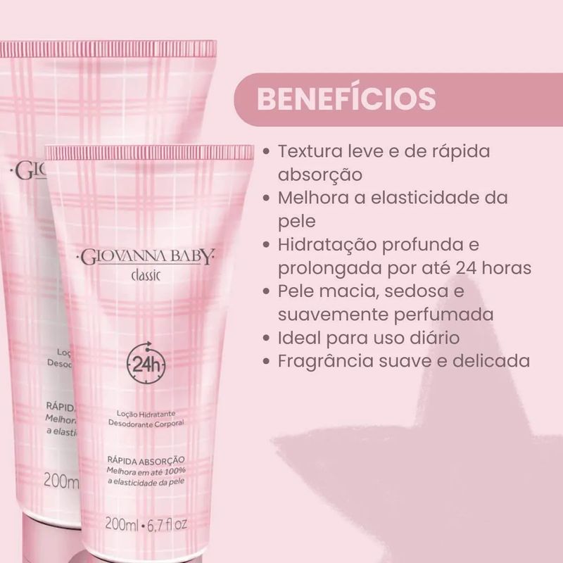 O que é e para que serve a Loção Hidratante Corporal Giovanna Baby Classic? Giovanna Baby Classic é uma loção hidratante corporal que proporciona uma pele profundamente hidratada por até 24h. Com uma textura leve e de fácil absorção, também melhora em 100% a elasticidade da pele. Ainda, contém uma suave fragrância que deixa a pele perfumada o dia todo, graças a sua fórmula enriquecida com flores deliciosamente cheirosas da natureza, entre elas a Lavanda, Rosa Chá, Jasmim e Muguet. Giovanna Baby Classic também foi testada dermatologicamente, para ser um toque de carinho para o seu dia.