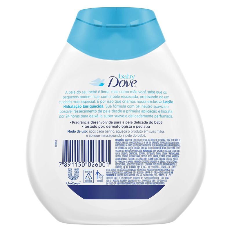 Loção Hidratante Dove Baby Hidratação Enriquecida 200mlLoção Hidratante Dove Baby Hidratação Enriquecida foi desenvolvido para o cuidado com a pele sensível e delicada do seu bebê, proporcionando 24h de hidratação profunda. Com pH neutro, aroma suave e fórmula hipoalergênica a Loção Hidratante Dove Baby Hidratação Enriquecida garante um perfume suave a pele do bebê por muito mais tempo, garantindo uma textura que adere facilmente à pele não deixando-a oleosa.
