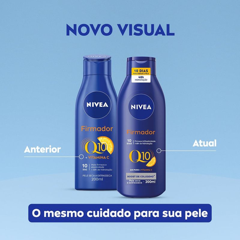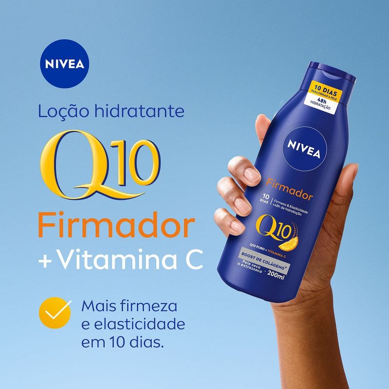 Loção Hiratante Nivea Firmador Q10+Vitamina C Pele Seca 200mlA Loção Hiratante Nivea Firmador Q10+Vitamina C para Peles Secas melhora vizivelmente a firmeza da pele e trabalha na elasticidade em apenas 10 dias. Graças a sua fórmula com esses dois excelentes antioxidantes Q10 e Vitamina C que são ótimos combatentes contra os radicais livres.