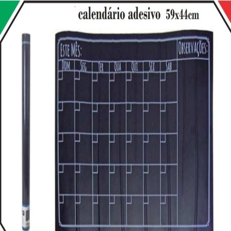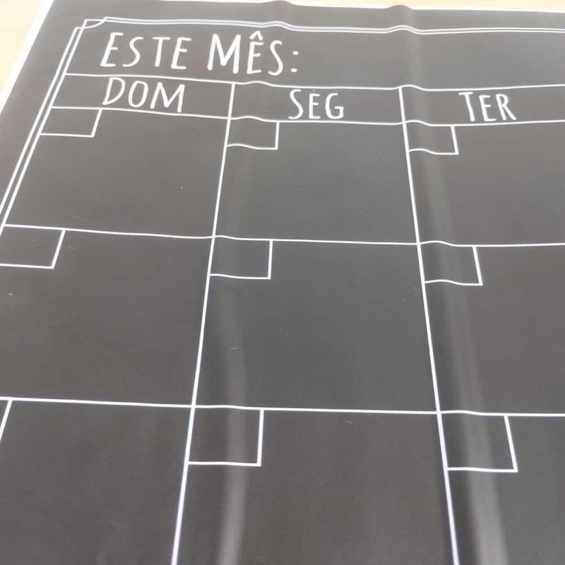 Lousa Calendario Adesivo Quadro Planner Mensal Semanal Organizador Atividades Tarefas Escreve ApagaAdesivo de Parede Lousa Calendário - Decoração Funcional e Divertida para Todos os Ambientes!Transforme qualquer espaço com o Adesivo de Parede Lousa Calendário, uma solução prática e criativa para organizar e decorar. Ideal para crianças soltarem a imaginação, manter recados, lembretes e listas de afazeres, este adesivo lousa é a combinação perfeita de funcionalidade e estilo.Características Principais:Versatilidade: Ideal para o quarto das crianças, sala de estudos, escritório, ou qualquer outro ambiente onde organização e diversão se encontram.Uso Prático: Pode ser utilizado com giz comum e é facilmente apagável, oferecendo uma superfície sempre pronta para novas anotações.Tamanho Ideal: Com dimensões de 44 x 60 cm, proporciona uma área ampla para escrever e desenhar, enquanto se adapta facilmente a diferentes espaços.Superfícies Recomendadas: Aplique em superfícies lisas e sem textura, como paredes com tinta acetinada, látex e acrílica, móveis, espelhos e portas. Evite aplicar em superfícies irregulares, texturizadas, ou em locais com infiltrações.Benefícios:Decoração Funcional: Perfeito para adicionar um toque divertido ao ambiente, enquanto proporciona uma superfície prática para organização e criatividade.Fácil Aplicação: Com recorte inteligente e alta precisão, o adesivo é fácil de aplicar, permitindo que você mesmo o coloque sem necessidade de profissional.Lavável e Resistente: O adesivo é lavável e resistente a produtos de limpeza domésticos, exceto produtos à base de cloro, garantindo praticidade e durabilidade.Observações:Não Adequado Para: Não é recomendado para carros, geladeiras, superfícies com tinta fresca, tinta magnética, ou superfícies com infiltrações.Garanta hoje o seu Adesivo de Parede Lousa Calendário e adicione um toque de organização e diversão ao seu espaço com um produto que combina praticidade e estilo!Adesivo de Parede Lousa Calendário - Decoração Funcional e Divertida para Todos os Ambientes!Transforme qualquer espaço com o Adesivo de Parede Lousa Calendário, uma solução prática e criativa para organizar e decorar. Ideal para crianças soltarem a imaginação, manter recados, lembretes e listas de afazeres, este adesivo lousa é a combinação perfeita de funcionalidade e estilo. Características Principais:Versatilidade: Ideal para o quarto das crianças, sala de estudos, escritório, ou qualquer outro ambiente onde organização e diversão se encontram. Uso Prático: Pode ser utilizado com giz comum e é facilmente apagável, oferecendo uma superfície sempre pronta para novas anotações. Tamanho Ideal: Com dimensões de 44 x 60 cm, proporciona uma área ampla para escrever e desenhar, enquanto se adapta facilmente a diferentes espaços. Superfícies Recomendadas: Aplique em superfícies lisas e sem textura, como paredes com tinta acetinada, látex e acrílica, móveis, espelhos e portas. Evite aplicar em superfícies irregulares, texturizadas, ou em locais com infiltrações. Benefícios:Decoração Funcional: Perfeito para adicionar um toque divertido ao ambiente, enquanto proporciona uma superfície prática para organização e criatividade. Fácil Aplicação: Com recorte inteligente e alta precisão, o adesivo é fácil de aplicar, permitindo que você mesmo o coloque sem necessidade de profissional. Lavável e Resistente: O adesivo é lavável e resistente a produtos de limpeza domésticos, exceto produtos à base de cloro, garantindo praticidade e durabilidade. Observações:Não Adequado Para: Não é recomendado para carros, geladeiras, superfícies com tinta fresca, tinta magnética, ou superfícies com infiltrações. Garanta hoje o seu Adesivo de Parede Lousa Calendário e adicione um toque de organização e diversão ao seu espaço com um produto que combina praticidade e estilo!
