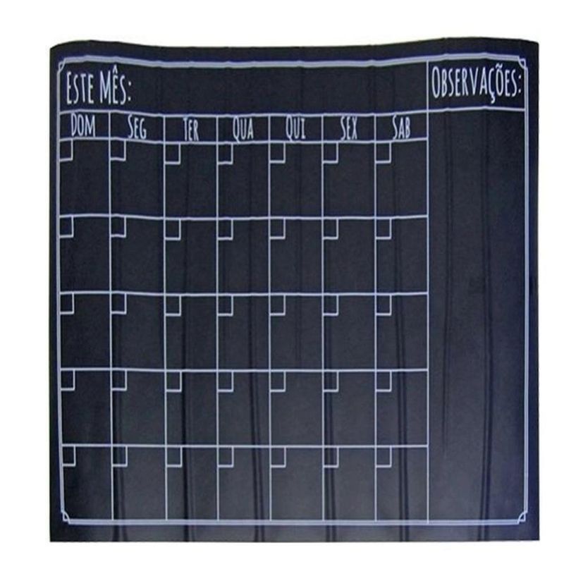 Lousa Calendario Adesivo Quadro Planner Mensal Semanal Organizador Atividades Tarefas Escreve ApagaAdesivo de Parede Lousa Calendário - Decoração Funcional e Divertida para Todos os Ambientes!Transforme qualquer espaço com o Adesivo de Parede Lousa Calendário, uma solução prática e criativa para organizar e decorar. Ideal para crianças soltarem a imaginação, manter recados, lembretes e listas de afazeres, este adesivo lousa é a combinação perfeita de funcionalidade e estilo.Características Principais:Versatilidade: Ideal para o quarto das crianças, sala de estudos, escritório, ou qualquer outro ambiente onde organização e diversão se encontram.Uso Prático: Pode ser utilizado com giz comum e é facilmente apagável, oferecendo uma superfície sempre pronta para novas anotações.Tamanho Ideal: Com dimensões de 44 x 60 cm, proporciona uma área ampla para escrever e desenhar, enquanto se adapta facilmente a diferentes espaços.Superfícies Recomendadas: Aplique em superfícies lisas e sem textura, como paredes com tinta acetinada, látex e acrílica, móveis, espelhos e portas. Evite aplicar em superfícies irregulares, texturizadas, ou em locais com infiltrações.Benefícios:Decoração Funcional: Perfeito para adicionar um toque divertido ao ambiente, enquanto proporciona uma superfície prática para organização e criatividade.Fácil Aplicação: Com recorte inteligente e alta precisão, o adesivo é fácil de aplicar, permitindo que você mesmo o coloque sem necessidade de profissional.Lavável e Resistente: O adesivo é lavável e resistente a produtos de limpeza domésticos, exceto produtos à base de cloro, garantindo praticidade e durabilidade.Observações:Não Adequado Para: Não é recomendado para carros, geladeiras, superfícies com tinta fresca, tinta magnética, ou superfícies com infiltrações.Garanta hoje o seu Adesivo de Parede Lousa Calendário e adicione um toque de organização e diversão ao seu espaço com um produto que combina praticidade e estilo!Adesivo de Parede Lousa Calendário - Decoração Funcional e Divertida para Todos os Ambientes!Transforme qualquer espaço com o Adesivo de Parede Lousa Calendário, uma solução prática e criativa para organizar e decorar. Ideal para crianças soltarem a imaginação, manter recados, lembretes e listas de afazeres, este adesivo lousa é a combinação perfeita de funcionalidade e estilo. Características Principais:Versatilidade: Ideal para o quarto das crianças, sala de estudos, escritório, ou qualquer outro ambiente onde organização e diversão se encontram. Uso Prático: Pode ser utilizado com giz comum e é facilmente apagável, oferecendo uma superfície sempre pronta para novas anotações. Tamanho Ideal: Com dimensões de 44 x 60 cm, proporciona uma área ampla para escrever e desenhar, enquanto se adapta facilmente a diferentes espaços. Superfícies Recomendadas: Aplique em superfícies lisas e sem textura, como paredes com tinta acetinada, látex e acrílica, móveis, espelhos e portas. Evite aplicar em superfícies irregulares, texturizadas, ou em locais com infiltrações. Benefícios:Decoração Funcional: Perfeito para adicionar um toque divertido ao ambiente, enquanto proporciona uma superfície prática para organização e criatividade. Fácil Aplicação: Com recorte inteligente e alta precisão, o adesivo é fácil de aplicar, permitindo que você mesmo o coloque sem necessidade de profissional. Lavável e Resistente: O adesivo é lavável e resistente a produtos de limpeza domésticos, exceto produtos à base de cloro, garantindo praticidade e durabilidade. Observações:Não Adequado Para: Não é recomendado para carros, geladeiras, superfícies com tinta fresca, tinta magnética, ou superfícies com infiltrações. Garanta hoje o seu Adesivo de Parede Lousa Calendário e adicione um toque de organização e diversão ao seu espaço com um produto que combina praticidade e estilo!