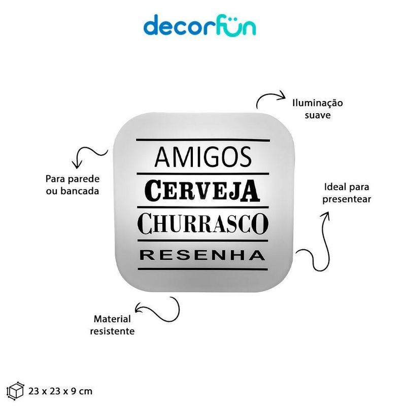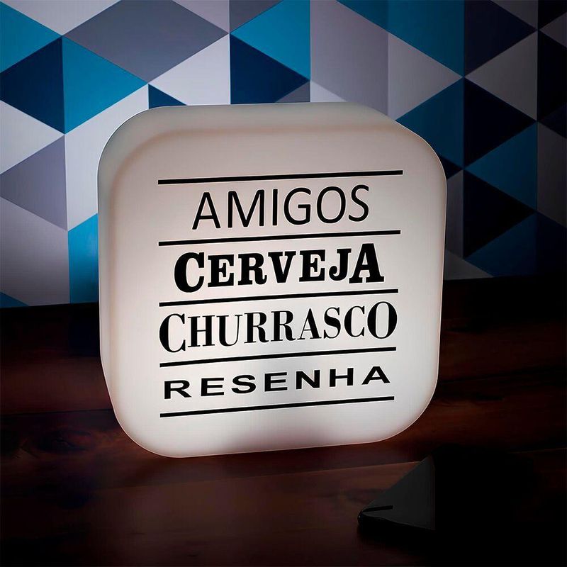 Luminária Box Resenha Entre AmigosCom a Lumiária Box Resenha Entre Amigos os encontros ficarão ;muito mais divertidos!A luminária fala exatamente tudo o que amamos fazer entre amigos. Garanta diversão para todos os eventos da turma!Especificações do produto:Tamanho: ;23 x 23 x 9cmMaterial: PolietilenoTensão: 110V/220VAlimentação: Cabo de força ;com interruptor medindo 1,8m de comprimentoCuidados: Limpar com pano úmido e macio. Teme químicos e abrasivos. Não utilizar lâmpadas incandescentes de qualquer tipoCom a Lumiária Box Resenha Entre Amigos os encontros ficarão ;muito mais divertidos!A luminária fala exatamente tudo o que amamos fazer entre amigos. Garanta diversão para todos os eventos da turma!Especificações do produto:Tamanho: ;23 x 23 x 9cmMaterial: PolietilenoTensão: 110V/220VAlimentação: Cabo de força ;com interruptor medindo 1,8m de comprimentoCuidados: Limpar com pano úmido e macio. Teme químicos e abrasivos. Não utilizar lâmpadas incandescentes de qualquer tipo