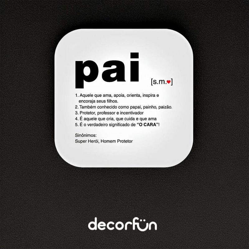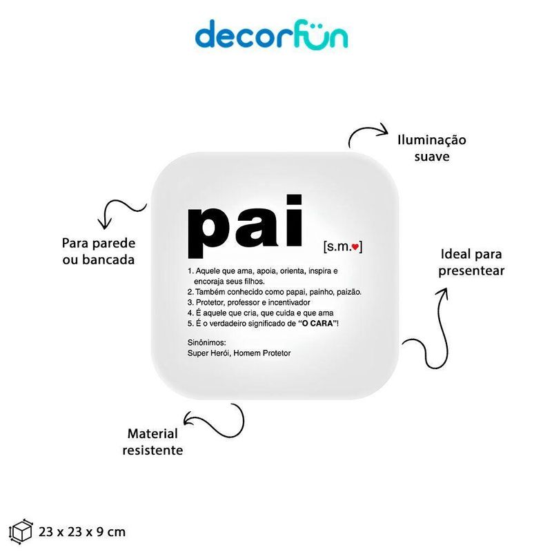 Luminária Box Significado PaiSurpreenda seu pai com a ;Luminária Box Significado Pai!Decore qualquer ambiente com ;a Luminária Box Significado Pai, ela vai encantar o seu quarto, aquele seu cantinho especial e até mesmo o seu escritório. Além de ser um item incrível, ela pode agregar no espaço de leitura por ser uma luz difusa, o que não agride a visão, além de deixar o local com uma iluminação mais baixa. Sendo Bivolt com a ;Luminária Box Significado Pai, você não precisa se preocupar com nada, basta ligar na tomada e ligar. ;Especificações do produto:Material: Polietileno ;e componentes eletrônicosDimensões: 23 x 23 x 9 ;cmAlimentação: Cabo de força com interruptor medindo 1,8m de comprimentoCuidados: Limpar com pano úmido e macioInformações adicionais: Compactas fluorescentes até 10W ou LED compatível com abertura inferior da luminária (lâmpadas não inclusas) (E-27)Cuidados: Limpar com pano úmido e macio. Teme químicos e abrasivos. Não utilizar lâmpadas incandescentes de qualquer tipo.Perguntas frequentesA luminária pode ser pendurada na parede ?Sim ela pode ser pendurada na parede, já consta com furos para ser instalada (parafusos não inclusos).Surpreenda seu pai com a ;Luminária Box Significado Pai!Decore qualquer ambiente com ;a Luminária Box Significado Pai, ela vai encantar o seu quarto, aquele seu cantinho especial e até mesmo o seu escritório. Além de ser um item incrível, ela pode agregar no espaço de leitura por ser uma luz difusa, o que não agride a visão, além de deixar o local com uma iluminação mais baixa. Sendo Bivolt com a ;Luminária Box Significado Pai, você não precisa se preocupar com nada, basta ligar na tomada e ligar. ;Especificações do produto:Material: Polietileno ;e componentes eletrônicosDimensões: 23 x 23 x 9 ;cmAlimentação: Cabo de força com interruptor medindo 1,8m de comprimentoCuidados: Limpar com pano úmido e macioInformações adicionais: Compactas fluorescentes até 10W ou LED compatível com abertura inferior da luminária (lâmpadas não inclusas) (E-27)Cuidados: Limpar com pano úmido e macio. Teme químicos e abrasivos. Não utilizar lâmpadas incandescentes de qualquer tipo.Perguntas frequentesA luminária pode ser pendurada na parede ?Sim ela pode ser pendurada na parede, já consta com furos para ser instalada (parafusos não inclusos).