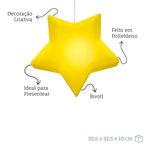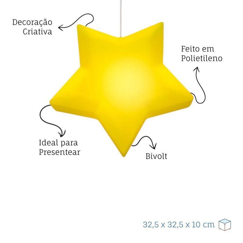 Luminária Pendente Estrela Infantil Amarela Bivolt Decoração QuartoA Luminária Pendente Estrela transforma qualquer ambiente, trazendo charme e brilho ao quarto. Com design delicado e iluminado, ela cria uma atmosfera acolhedora e mágica, perfeita para quartos infantis, festas ou cantinhos especiais da casa.- Design encantador: formato de estrela que adiciona magia à decoração.- Iluminação acolhedora: perfeita para criar um ambiente relaxante e aconchegante.- Bivolt automático (110/220V) — compatível com qualquer tomada.- Cabo de 1,8m com travessa de aço e canopla em plástico — fácil de instalar e posicionar.- Produzida em polietileno resistente, garantindo durabilidade e segurança.- Compatível com lâmpadas LED ou fluorescentes compactas até 10W (não inclusa).Especificações do produto:Cor: BrancoMaterial: PolietilenoDimensões: 32,5 x 32,5 x 10 cm (A x L x P)Cabo: 1,8 m com travessa de aço e canopla de plásticoTensão: Bivolt (110/220V)Instruções: Aceita alguns tamanhos de lâmpada LED que passem pela abertura.A Luminária Pendente Estrela transforma qualquer ambiente, trazendo charme e brilho ao quarto. Com design delicado e iluminado, ela cria uma atmosfera acolhedora e mágica, perfeita para quartos infantis, festas ou cantinhos especiais da casa.- Design encantador: formato de estrela que adiciona magia à decoração.- Iluminação acolhedora: perfeita para criar um ambiente relaxante e aconchegante.- Bivolt automático (110/220V) — compatível com qualquer tomada.- Cabo de 1,8m com travessa de aço e canopla em plástico — fácil de instalar e posicionar.- Produzida em polietileno resistente, garantindo durabilidade e segurança.- Compatível com lâmpadas LED ou fluorescentes compactas até 10W (não inclusa).Especificações do produto:Cor: BrancoMaterial: PolietilenoDimensões: 32,5 x 32,5 x 10 cm (A x L x P)Cabo: 1,8 m com travessa de aço e canopla de plásticoTensão: Bivolt (110/220V)Instruções: Aceita alguns tamanhos de lâmpada LED que passem pela abertura.