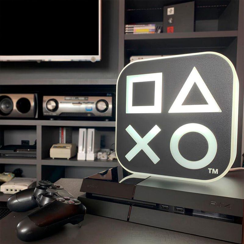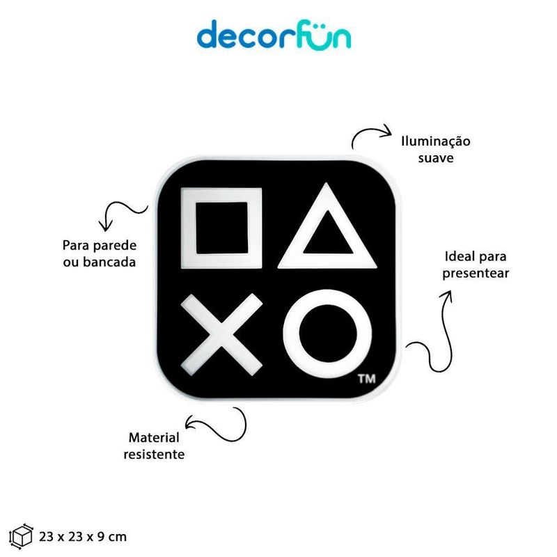 Luminária Playstation BlackboxÉ apaixonado pelo universo dos games? Então a Luminária Playstation Blackbox foi feita pra você!Com design inspirado no Playstation esta luminária de mesa vai decorar quarto, sala, bancada ou estante, oferecendo um clima mais moderno ao ambiente.Estilosa, Luminária Playstation Blackbox vai encantar você! É uma ótima sugestão de presente.Especificações do produto:Material: Plástico polietilenoMedições: 23 x 23 x 9cmPeso: 837gFonte de energia: Cabo com plugue de 2 pinos redondos para tomadaDimensões do cabo: 1,8cmTipo de luz: Fluorescente compacta ou LED (não acompanha)Potência da luz: Até 15WTensão de entrada: BivoltInformações de conservação: Limpe com pano úmido e macio. Não use produtos químicos ou abrasivosPerguntas Frequentes:- Serve qualquer tipo de lâmpada?Não, somente fluorescente compacta ou LED de até 15W. ;- Onde comprar a lâmpada?Em supermercados ou lojas de materiais de construção.É apaixonado pelo universo dos games? Então a Luminária Playstation Blackbox foi feita pra você!Com design inspirado no Playstation esta luminária de mesa vai decorar quarto, sala, bancada ou estante, oferecendo um clima mais moderno ao ambiente.Estilosa, Luminária Playstation Blackbox vai encantar você! É uma ótima sugestão de presente.Especificações do produto:Material: Plástico polietilenoMedições: 23 x 23 x 9cmPeso: 837gFonte de energia: Cabo com plugue de 2 pinos redondos para tomadaDimensões do cabo: 1,8cmTipo de luz: Fluorescente compacta ou LED (não acompanha)Potência da luz: Até 15WTensão de entrada: BivoltInformações de conservação: Limpe com pano úmido e macio. Não use produtos químicos ou abrasivosPerguntas Frequentes:- Serve qualquer tipo de lâmpada?Não, somente fluorescente compacta ou LED de até 15W. ;- Onde comprar a lâmpada?Em supermercados ou lojas de materiais de construção.