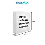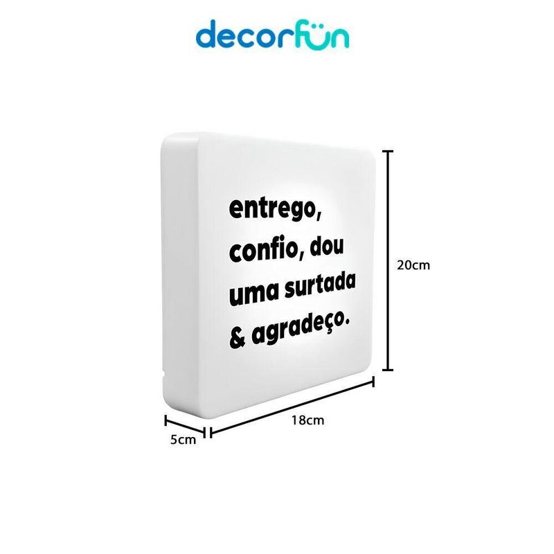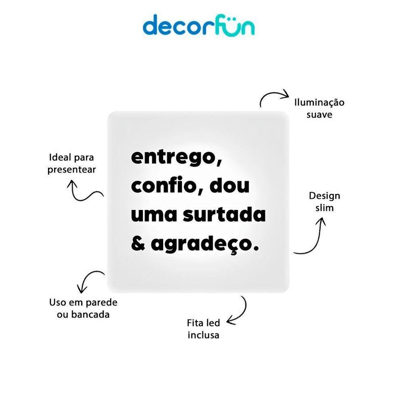 Luminária Slim Box Entrego E Agradeço Luz Indireta Presente UsbA Luminária Slim Box é a escolha perfeita para adicionar um toque de diversão e personalidade ao seu ambiente. Com sua luz indireta suave, ela transforma qualquer espaço, seja na mesa ou na parede, em um lugar mais aconchegante e moderno. Além de ser uma peça de decoração, ela é um presente ideal para quem gosta de iluminar a vida com humor e estilo!- Design criativo – Um quadrinho iluminado que traz charme e diversão.- Iluminação indireta – Luz suave, ideal para ambientes descontraídos.- Versátil – Pode ser colocada na parede ou sobre bancadas, conforme seu gosto.- USB prático – Conecte e use facilmente em qualquer tomada.- Presente único – Ideal para quem ama iluminar com personalidade.Deixe a Luminária Slim Box adicionar luz e diversão ao seu espaço ou presenteie alguém com esse toque de criatividade!Especificações do produto:Uso: Fixada na parede ou sobre bancadas.Tamanho (cm): 23 x 23 x 9 ( Altura x Largura x Profundidade)Lâmpadas: Compactas fluorescentes até 10W ou LED compatível com abertura inferior da luminária (LÂMPADAS NÃO INCLUSAS) (E-27)Material: PolietilenoTensão: 110V/220VAlimentação: Cabo de força com interruptor medindo 1,8m de comprimentoCuidados:- Limpar com pano úmido e macio.- Teme químicos e abrasivos.- Não utilizar lâmpadas incandescentes de qualquer tipoA Luminária Slim Box é a escolha perfeita para adicionar um toque de diversão e personalidade ao seu ambiente. Com sua luz indireta suave, ela transforma qualquer espaço, seja na mesa ou na parede, em um lugar mais aconchegante e moderno. Além de ser uma peça de decoração, ela é um presente ideal para quem gosta de iluminar a vida com humor e estilo!- Design criativo – Um quadrinho iluminado que traz charme e diversão.- Iluminação indireta – Luz suave, ideal para ambientes descontraídos.- Versátil – Pode ser colocada na parede ou sobre bancadas, conforme seu gosto.- USB prático – Conecte e use facilmente em qualquer tomada.- Presente único – Ideal para quem ama iluminar com personalidade.Deixe a Luminária Slim Box adicionar luz e diversão ao seu espaço ou presenteie alguém com esse toque de criatividade!Especificações do produto:Uso: Fixada na parede ou sobre bancadas.Tamanho (cm): 23 x 23 x 9 ( Altura x Largura x Profundidade)Lâmpadas: Compactas fluorescentes até 10W ou LED compatível com abertura inferior da luminária (LÂMPADAS NÃO INCLUSAS) (E-27)Material: PolietilenoTensão: 110V/220VAlimentação: Cabo de força com interruptor medindo 1,8m de comprimentoCuidados:- Limpar com pano úmido e macio.- Teme químicos e abrasivos.- Não utilizar lâmpadas incandescentes de qualquer tipo