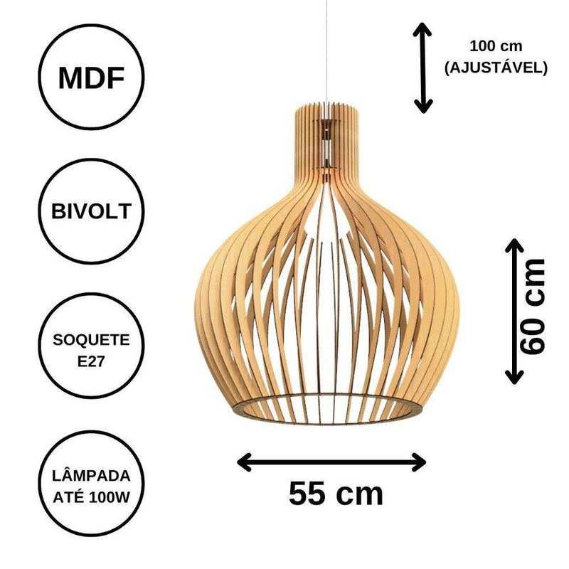 Luminária Teto Tipo Pendente Estocolmo Mdf - Completa Mdf CruFicha técnica:Altura: 60 cmLargura: 55 cmDiâmetro: 55 cmEspessura: 3 cmMateriais: Madeira MDFAlimentação: Bivolt 110v / 220vPotência: 100 WAmbientes: Exterior e InteriorQuantidade de lâmpadas: 1Tipos de fontes de luz: Soquete E27Cabo flexível e ajustávelMaterial da canopla (peça de acabamento para o teto): Termoplástico IndustrialNão é recomendável para lugares sem proteção contra chuvaEnvio: Desmontado para não ter avarias no transporte, bem fácil de montar