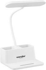 Marca: VonderCódigo: 8074000829Conteúdo da embalagem1 Luminária. Acompanha: 1 cabo USB para carregamento.Destaques e diferenciais:Prática e portátil, possui estrutura em plástico ABS, garantindo maior durabilidade e resistência. Conta com bateria recarregável de Íons de Lítio e haste articulada, facilitando o direcionamento do foco de luz para o local desejado. Além disso, possui 3 níveis de luminosidade e comando touch para acionamento e variação entre os níveis de luminosidade. Conta ainda com porta-objetos e celular, fornecendo maior organização e praticidade.Aplicações e dicas de uso:Indicada para iluminação em mesas, para leitura e estudo.Potência: 2 W Tipo de bateria: 3,7 V / 1200 mAh - Íons de lítio Tipo do LED: SMD Quantidade de LEDs : 20 Cor do LED (Kelvin): 3.000 K / 4.000 K / 5.000 K Fluxo luminoso (lúmen): 30 lm / 75 lm / 150 lm Índice de proteção (IP): IP20 Entrada de carregamento: 5 V - 1 Ah DC Dimensões (C x L x A): 120 mm x 115 mm x 400 mm Massa aproximada (peso) (kg): 0,256 kg Garantia - E (CDC):Garantia legal: 90 dias