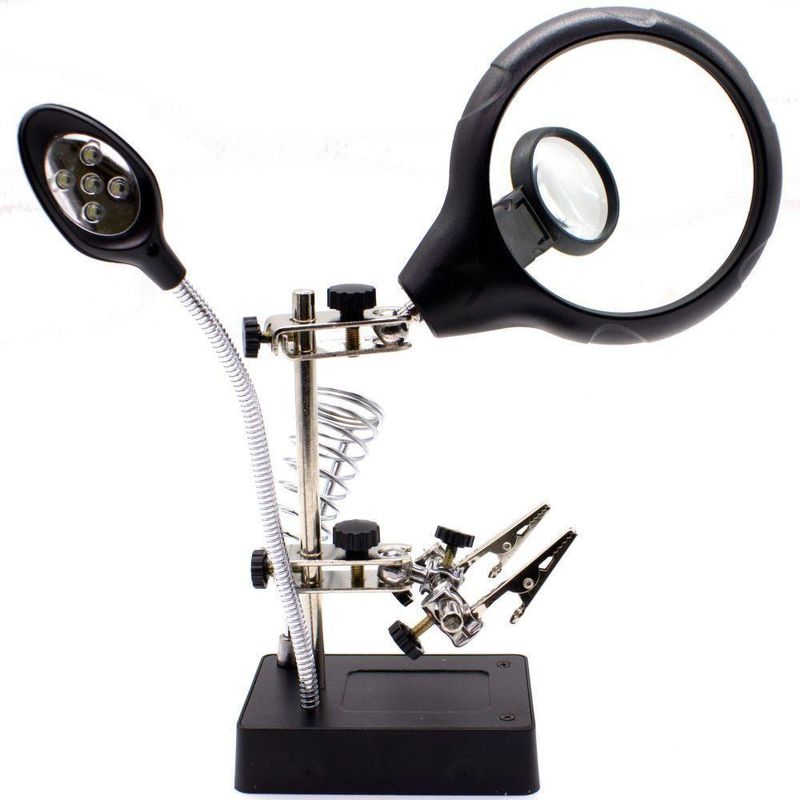 Lupa de Mesa com Garras e Iluminação Led LorbenEsta lupa facilitará a observação de detalhes em seu trabalho. Ela possui garras para fixação, iluminação integrada por 5 LED’S e 2 lentes com diferentes ampliações: 34mm e 90mm. Sua alimentação é com 3 pilhas AA (não inclusas) ou via fonte bivolt inclusa que, quando utilizada, desativa o uso das pilhas automaticamente.Ideal para trabalhos que necessitem de uma “terceira mão”Uso indicado para engenheiros eletrônicos, estudantes, cientistas, colecionadores ou qualquer que necessite visualizar detalhesSuas garras móveis fixam os materiais a serem observadosIluminação com ajuste de posiçãoAuxilia a observação em ambientes com pouca ou nenhuma luzQuando utilizada com a fonte economiza a energia das pilhas para trabalhos futurosSuporte e base ajustáveisSuperfície da base preenchida com chapa de aço para aumentar o peso e reforçar a estabilidadeMarca: LorbenAlimentação: 3 pilhas AA ou via fonte externa bivolt (inclusa) Material: Polipropileno e VidroCor: Preto/PrataInclui:1 Base do suporte 1 Lente de 90 milímetros de diâmetro (2.5X)2 Lentes de 34 milímetros de diâmetro (5X, 8X)1 Manual de usuário1 Fonte de energia bivolt 110V/220VTamanho do produto: aproximadamente 20x11x17cmPeso do produto: 515gTamanho da embalagem: 20x14x11 cmPeso: 640gImagens ilustrativas. As tonalidades podem variar.