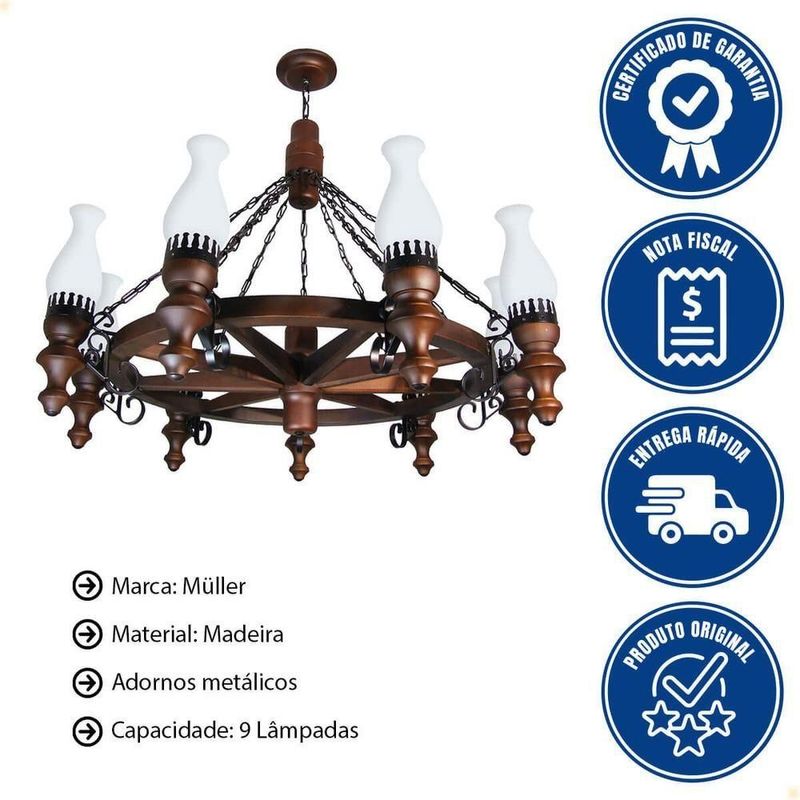 Lustre Muller Roda Carroça 9 Lâmpadas Envelhecido 909e- Transforme seu ambiente com o charme rústico do Lustre Roda Carroça 9LP Envelhecido 909E da Muller.- Com design exclusivo inspirado em rodas de carroça, ele traz personalidade e aconchego para qualquer espaço.- Produzido em madeira de reflorestamento, une sustentabilidade e sofisticação — perfeito para quem valoriza estilo com consciência.- Garanta já o seu e impressione com uma iluminação que conta história!LUSTRE RODA CARROÇA 9LP ENVELHECIDO 909EMarca: MullerModelo: Carroça 909E- Trabalhada em madeira proveniente de florestas de reflorestamento e dessa forma respeitando o meio ambiente. A linha rústica destaca os desenhos naturais e únicos das fibras de madeira. Tornando os ambientes mais aconchegantes e confortáveis.- Os vidros empregados são produzidos pelo processo de sopro e utilizam apenas matéria prima virgem e sem compostos reciclados conferindo um melhor aproveitamento luminoso. Sem alteração da temperatura de cor emitida pela lâmpada.- Os adornos metálicos trabalhados artesanalmente recebem tratamento superficial e são pintados eletrostaticamente com tinta a pó de alta resistência.- A Linha Rústica da Muller é a certeza de produtos de qualidade e acabamento.ESPECIFICAÇÕES TÉCNICAS- Lâmpadas: 9. - NÃO ACOMPANHA AS LÂMPADAS.- Lâmpada Led 9W.- Lâmpada de filamento vela.- Soquete E27.GARANTIA- 3 mesesDIMENSÕES- Altura: 100 cm.- Diâmetro total: 90 cm.- Diâmetro da roda: 70 cm.- Altura do vidro: 19 cm.- Diâmetro do vidro: 9 cm.PERGUNTAS FREQUENTES:1. As lâmpadas já vêm inclusas com o lustre?Não, o lustre não acompanha as lâmpadas. Ele possui 9 soquetes E27, compatíveis com lâmpadas LED de 9W ou lâmpadas de filamento tipo vela.2. O lustre é sustentável?Sim! A estrutura é feita com madeira de reflorestamento, respeitando o meio ambiente. Além disso, os vidros soprados utilizam apenas matéria-prima virgem, garantindo eficiência luminosa sem distorção da cor emitida.3. Qual é o tamanho do Lustre Roda Carroça 9LP?As dimensões são:Altura total: 100 cm, Diâmetro total: 90 cm, Diâmetro da roda: 70 cm, Altura do vidro: 19 cm eDiâmetro do vidro: 9 cm.4. Qual o diferencial dos acabamentos do produto?Os adornos metálicos são trabalhados artesanalmente e recebem pintura eletrostática com tinta a pó, o que oferece maior resistência e durabilidade ao acabamento.5. Qual é a garantia oferecida pela marca?A Muller oferece uma garantia de 3 meses contra de fabricação no Lustre Roda Carroça 9LP Envelhecido 909E. Unidades por embalagem: 1 | Formato da luminária: Lustre | Lugares de montagem: Teto | Materiais: Madeira, Metal, Vidro | Alimentação: Elétrico | Potência: 9 W | Ambientes: Internos | Capacidade de lâmpadas: 9 | Tipos de fontes de luz: LED | Com wi-fi: Não | Aplicações inteligentes compatíveis: Não | Tipo de luminária de teto: Lustre | É pendente: Sim | Comprimento: 0 | Altura: 100 cm | Tipo de soquete da lâmpada: E27 | Sem fio: Não | Autoadesiva: Não | Controle remoto: Não | Sistema de pressão: Não | Wi-Fi: Não | Assistentes virtuais compatíveis: Não | Principais Características do Produto: Madeira | Regulamentações de produtos perigosos: 0 | Fabricante: Müller | Dias Fornecedor: 1 | EmbalagemComprimento-cm: 102 | Marca: Luminárias Muller | Modelo: Roda de Carroça | Peso Líquido: 0.0000 | Cubagem: 0.499392 | EmbalagemLargura-cm: 102 | EmbalagemAltura-cm: 48