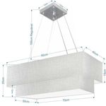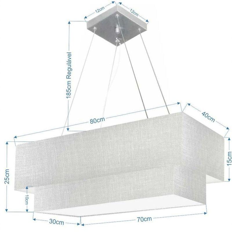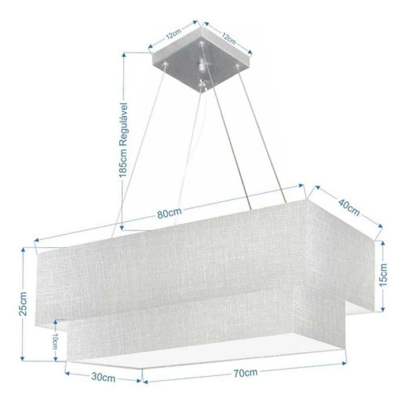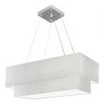 Lustre Pendente Duplo Retangular Vivare Md-4321 Cúpula Em Tecido 80x40cm X 70x30cm - Bivolt Rustico-cinza 127/220vLustre Pendente Duplo Retangular Vivare Md-4321 Cúpula em Tecido 80x40cm x 70x30cm - BivoltVocê já deve ter reparado que os pendente retangular duplo são luminária suspensa que oferecem um charme único aos espaços e estão cada vez mais presentes na decoração. Utilizamos em nossa casa em uma mesa de jantar e só escolha a cor da cúpula em tecido que mais combine com seu ambientes.DimensãoCúpula em Tecido: 25x80x40cmFormato: retangularTamanho: GrandeFio e Cabo Ajustável: 185cmTipo Pendente: TetoEspecificaçãoMateriais: Cúpula em TecidoCanopla Teto: Alumínio quadrado 12x12x2cmFechamento Tampa inferior (sim)Resistente: á maresiaVoltagem: 110V/220VTipo de Soquete: e27Tipos de Lâmpada: Led Bulbo Até 16w ou Fluorescente Espiral Até 25w CadaQuantidade de lâmpada necessária 4ObservaçãoAcompanha Lâmpada: nãoPossui Led Integrado: nãoGarantia: 12 mesesManual de Instalação: simPendente Montado: simControle de Luminosidade: nãoPeso do produto 3,300 kgTipo de Embalagem: CaixaFixação em teto de gesso, forro de pvc, forro madeira, reboco, alvenaria, tijolo etc