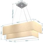 Lustre Pendente Duplo Retangular Vivare Md-4322 Cúpula Em Tecido 99x40cm X 80x30cm - Bivolt Algodão-crú 127/220vLustre Pendente Duplo Retangular Vivare Md-4322 Cúpula em Tecido 99x40cm x 80x30cm - BivoltVocê já deve ter reparado que os pendente retangular duplo são luminária suspensa que oferecem um charme único aos espaços e estão cada vez mais presentes na decoração. Utilizamos em nossa casa em uma mesa de jantar e só escolha a cor da cúpula em tecido que mais combine com seu ambientes.DimensãoCúpula em Tecido: 25x99x40cmFormato: retangularTamanho: GrandeFio e Cabo Ajustável: Altura 1,85 metrosTipo Pendente: TetoEspecificaçãoMateriais: Cúpula em TecidoCanopla Teto: Alumínio quadrado 12x12x2cmFechamento Tampa inferior (sim)Resistente: á maresiaVoltagem: 110V/220VTipo de Soquete: e27Tipos de Lâmpada: Led Bulbo Até 16w ou Fluorescente Espiral Até 25w CadaQuantidade de lâmpada necessária 4ObservaçãoAcompanha Lâmpada: nãoPossui Led Integrado: nãoGarantia: 12 mesesManual de Instalação: simPendente Montado: simControle de Luminosidade: nãoPeso do produto 3,300 kgTipo de Embalagem: CaixaFixação em teto de gesso, forro de pvc, forro madeira, reboco, alvenaria, tijolo etc