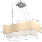 Lustre Pendente Duplo Retangular Vivare Md-4322 Cúpula Em Tecido 99x40cm X 80x30cm - Bivolt Algodão-crú-branco 127/220vLustre Pendente Duplo Retangular Vivare Md-4322 Cúpula em Tecido 99x40cm x 80x30cm - BivoltVocê já deve ter reparado que os pendente retangular duplo são luminária suspensa que oferecem um charme único aos espaços e estão cada vez mais presentes na decoração. Utilizamos em nossa casa em uma mesa de jantar e só escolha a cor da cúpula em tecido que mais combine com seu ambientes.DimensãoCúpula em Tecido: 25x99x40cmFormato: retangularTamanho: GrandeFio e Cabo Ajustável: Altura 1,85 metrosTipo Pendente: TetoEspecificaçãoMateriais: Cúpula em TecidoCanopla Teto: Alumínio quadrado 12x12x2cmFechamento Tampa inferior (sim)Resistente: á maresiaVoltagem: 110V/220VTipo de Soquete: e27Tipos de Lâmpada: Led Bulbo Até 16w ou Fluorescente Espiral Até 25w CadaQuantidade de lâmpada necessária 4ObservaçãoAcompanha Lâmpada: nãoPossui Led Integrado: nãoGarantia: 12 mesesManual de Instalação: simPendente Montado: simControle de Luminosidade: nãoPeso do produto 3,300 kgTipo de Embalagem: CaixaFixação em teto de gesso, forro de pvc, forro madeira, reboco, alvenaria, tijolo etc