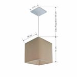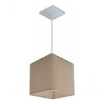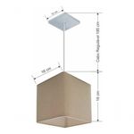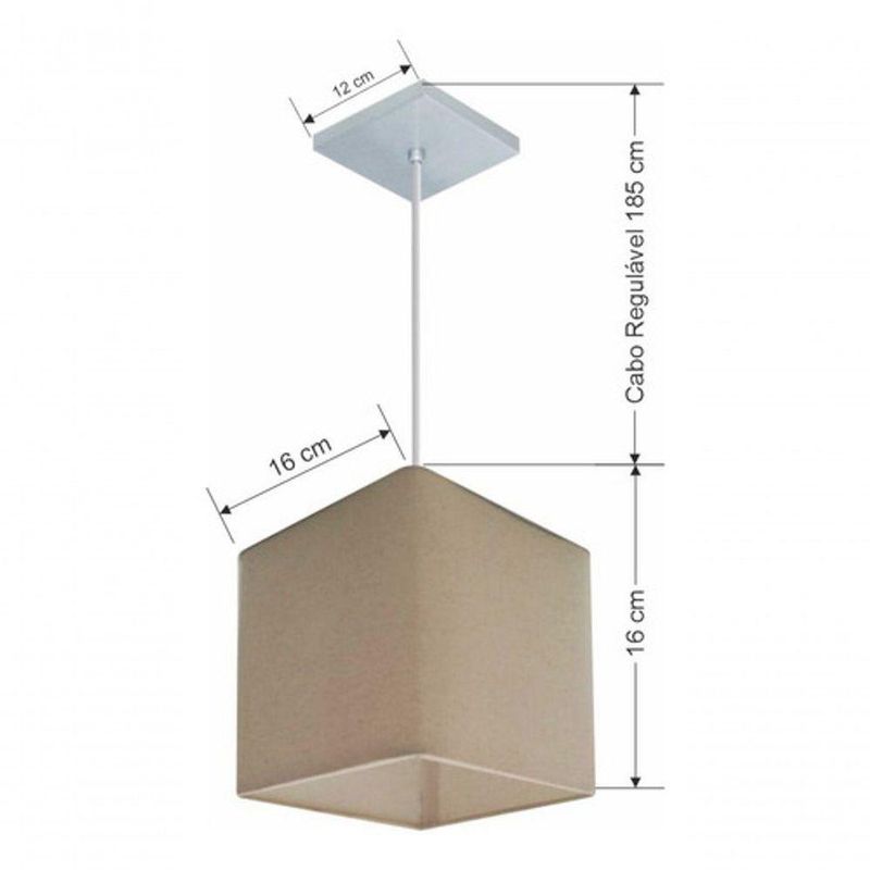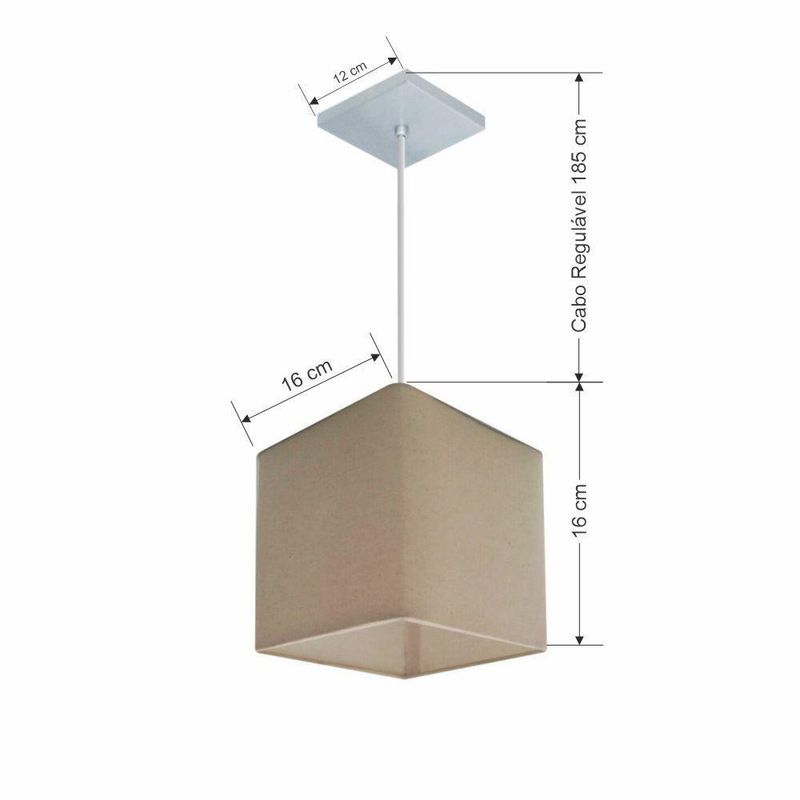 Lustre Pendente Quadrado Md-4224 Cúpula Em Tecido 16/16x16cm Algodão Crú - BivoltLustre Pendente Quadrado Md-4224 Cúpula Tecido 16/16x16cm Algodão CrúPendente quadrado apresenta facilidade na instalação e manutenção e limpeza, além de possibilitar o ajuste da altura de acordo com suas necessidades. O que oferecem um charme único aos espaços e estão cada vez mais presentes na decoração.DimensãoCúpula em Tecido: 16x16x16cmFormato: QuadradoTamanho: PequenoFio e Cabo Ajustável: 185cmTipo Pendente: TetoEspecificaçãoMateriais: Cúpula em TecidoCanopla Teto: Alumínio Quadrado 12x12cm Cor PrataCúpula: Sem TampaResistente: Á MaresiaVoltagem: 110V/220VTipo de Soquete: E27Tipos de lâmpada: Led Bulbo Até 16w ou Fluorescente Espiral Até 25w CadaCapacidade de lâmpada: 1ObservaçãoAcompanha Lâmpada: NãoPossui Led Integrado: NãoGarantia: 12 MesesManual de Instalação: SimPendente Montado: SimControle de Luminosidade: NãoTipo de Embalagem: CaixaFixaçãoForro de laje, Forro de gesso acartonado, Forro de madeira, Forro de lã de vidro, Forro de PVC, Forro modular, Forro alvenaria.Conservação e Manutenção do ProdutoA Limpeza deve ser realizada com o produto desligado. Remova o lustre que pode ser lavado com sabão neutro. Nunca utilize produtos químicos e abrasivosDicaAntes de comprar o seu produto verifique as medidas, o local onde pretende instalar e se necessário o serviço de um profissional qualificado.
