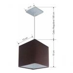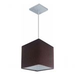 Lustre Pendente Quadrado Vivare Md-4223 Cúpula Em Tecido 15/13x13cm - Bivolt Café 127/220vLustre Pendente Quadrado Vivare Md-4223 Cúpula Tecido 15/13x13cmPendente quadrado apresenta facilidade na instalação e manutenção e limpeza, além de possibilitar o ajuste da altura de acordo com suas necessidades. O que oferecem um charme único aos espaços e estão cada vez mais presentes na decoração.DimensãoCúpula em Tecido: 15x13x13cmFormato: QuadradoTamanho: PequenoFio e Cabo Ajustável: 185cmTipo Pendente: TetoEspecificaçãoMateriais: Cúpula em TecidoCanopla Teto: Alumínio Quadrado 12x12cm Cor PrataCúpula: Sem TampaResistente: Á MaresiaVoltagem: 110V/220VTipo de Soquete: E27Tipos de lâmpada: Led Bulbo Até 16w ou Fluorescente Espiral Até 25w CadaCapacidade de lâmpada: 1ObservaçãoAcompanha Lâmpada: NãoPossui Led Integrado: NãoGarantia: 12 MesesManual de Instalação: SimPendente Montado: SimControle de Luminosidade: NãoTipo de Embalagem: CaixaFixaçãoForro de laje, Forro de gesso acartonado, Forro de madeira, Forro de lã de vidro, Forro de PVC, Forro modular, Forro alvenaria.Conservação e Manutenção do ProdutoA Limpeza deve ser realizada com o produto desligado. Remova o lustre que pode ser lavado com sabão neutro. Nunca utilize produtos químicos e abrasivosDicaAntes de comprar o seu produto verifique as medidas, o local onde pretende instalar e se necessário o serviço de um profissional qualificado.