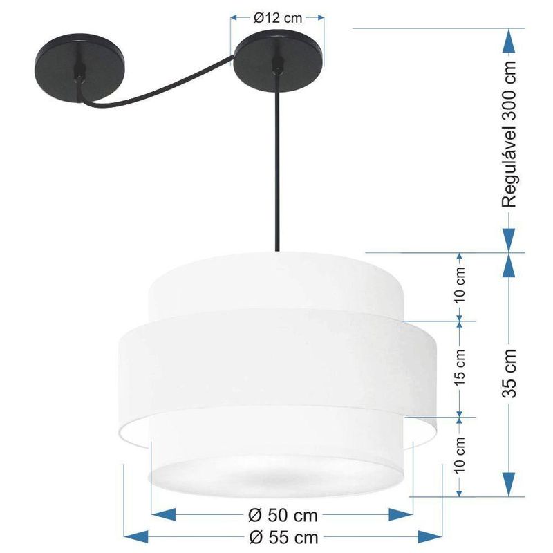Lustre Sala De Jantar Com Desvio Vivare Md-4400 Cúpula Em Tecido 55cm Branco 127/220vLustre de Jantar Com Desvio Vivare Md-4400 Cúpula em Tecido 55cm - BivoltOs lustres sala de jantar com desvio podem ter diferentes Formato:, tamanhos e acessórios para fazer o deslocamento, permitindo que você escolha a posição onde melhor se adequa às necessidades da sua mesa sala de jantar. Para a iluminação geral, ou seja, para clárear todo o ambiente de forma uniforme, os lustres com várias lâmpadas e iluminação difusa são excelentes opções.DimensãoCúpula em Tecido: 50x55x50cmFormato: CilíndricoTamanho: GrandeFio e Cabo Ajustável: Altura 3,0 MetrosTipo Pendente: TetoEspecificaçãoMateriais: Cúpula em Tecido2 Canopla Teto Alumínio Diâmetro 12x2cm Cor PretaCúpula Com Tampa: InferiorResistente: Á MaresiaVoltagem: 110V/220VTipo de Soquete: E27Tipos de lâmpada: Led Bulbo Até 16w ou Fluorescente Espiral Até 25w CadaCapacidade de lâmpadas: 3ObservaçãoAcompanha Lâmpada: NãoPossui Led Integrado: NãoGarantia: 12 MesesManual de Instalação: SimPendente Montado: SimControle de Luminosidade: NãoTipo de Embalagem: CaixaFixaçãoForro de laje, Forro de gesso acartonado, Forro de madeira, Forro de lã de vidro, Forro de PVC, Forro modular, Forro alvenaria.Conservação e Manutenção do ProdutoA Limpeza deve ser realizada com o produto desligado. Remova o lustre que pode ser lavado com sabão neutro. Nunca utilize produtos químicos e abrasivosDicaAntes de comprar o seu produto verifique as medidas, o local onde pretende instalar e se necessário o serviço de um profissional qualificado.