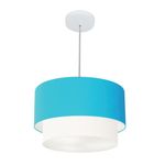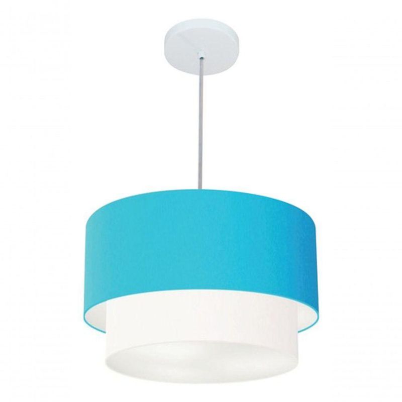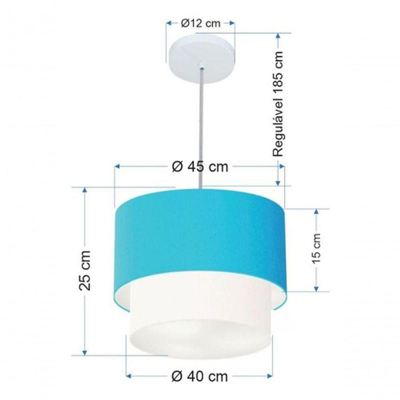Lustres Pendentes Duplo Cilíndrico Vivare Md-4350 Cúpula Em Tecido 45x40cm - Bivolt Azul-turquesa-branco 127/220vLustres Pendente Duplo Cilíndrico Vivare Md-4350 Cúpula em Tecido 45x40cmPendente Moderno Indicado para decoração área interna, como mesas, sala de estar, sala de jantar, suíte, quartos, corredor, hall, mezanino, escadas, churrasqueira, lareira, área de circulação, lojas, comércios, restaurante, varanda, balcão.DimensãoCúpula em Tecido: 25x45x40cmFormato: CilíndricoTamanho: MédioFio e Cabo Ajustável: 185cmTipo Pendente: TetoEspecificaçãoMateriais: Cúpula em TecidoCanopla Teto: Alumínio Diâmetro 12x2cm Cor BrancoCúpula Com Tampa: InferiorResistente: Á MaresiaVoltagem: 110V/220VTipo de Soquete: E27Tipos de lâmpada: Led Bulbo Até 16w ou Fluorescente Espiral Até 25w CadaCapacidade de lâmpada: 1ObservaçãoAcompanha Lâmpada: NãoPossui Led Integrado: NãoGarantia: 12 MesesManual de Instalação: SimPendente Montado: SimControle de Luminosidade: NãoTipo de Embalagem: CaixaFixaçãoForro de laje, Forro de gesso acartonado, Forro de madeira, Forro de lã de vidro, Forro de PVC, Forro modular, Forro alvenaria.Conservação e Manutenção do ProdutoA Limpeza deve ser realizada com o produto desligado. Remova o lustre que pode ser lavado com sabão neutro. Nunca utilize produtos químicos e abrasivosDicaAntes de comprar o seu produto verifique as medidas, o local onde pretende instalar e se necessário o serviço de um profissional qualificado.