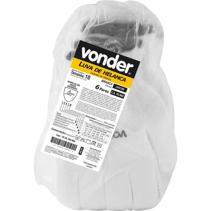 Luva de Helanca Branca, Lhv100, Vonder - Conteúdo da embalagem: 1 Pacote com 6 pares de luvas. Aplicação: Luva para proteção contra agentes mecânicos escoriantes e cortantes. Indicada para atividades que demandam proteção das mãos sem perder a sensibilidade tátil em contato com objetos secos e abrasivos, como: operações com transporte de objetos leves, agricultura (colheita de café), manutenção e reparo, atividades de aspecto (inspeção de qualidade do produto acabado) e uso geral em atividades que demandam proteção das mãos e do objeto manuseado. Destaques: Luva de segurança em material sintético na cor branca, com acabamento do punho em overlock na cor preta. Oferece ótimo tato, destreza e conforto. Referência: 7025100000 Garantia - E (CDC): Garantia legal: 90 dias Certificados: 48556 Massa aproximada (peso): 0.056 kg Tamanho da luva: 10 (único) Material da luva: 100% Poliéster Cor da luva: Branca Modelo: 7025100000 Material do punho: Tricotada em Helanca Dorso: Sem revestimento Material do revestimento da luva tricotada: Sem revestimento Destaques Comercial: Luva sintética branca com punho preto em overlock, oferece ótimo tato, destreza e conforto. Aplicação Comercial: Luva contra riscos mecânicos e cortes, indicada para tarefas que exigem proteção sem perda de tato, em objetos secos e abrasivos, como transporte, colheita, manutenção, inspeção e uso geral. Características Gerais do Produto: Garantia: • 3 Meses