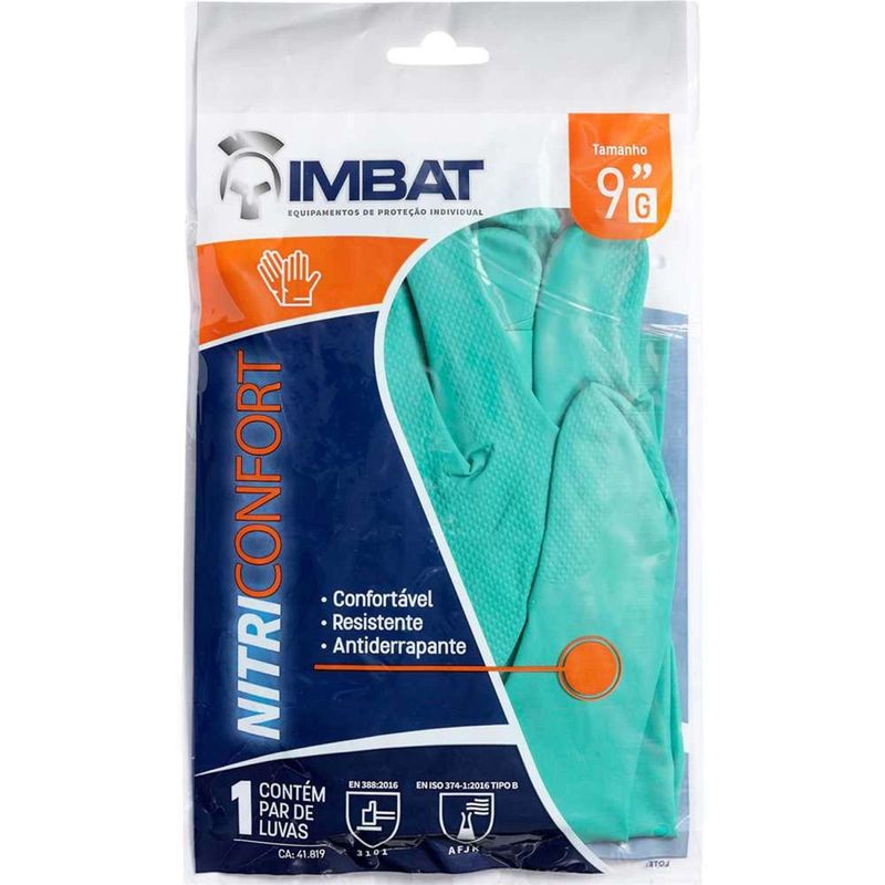 Luva Nitrílica, Verde, com Forro, Palma Antiderrapante, Tamanho 9 (g), Lv-nvf-9 Imbat - Conteúdo da embalagem: 1 Par de luvas. Aplicação: Indicada para proteção das mãos do usuário em operações leves em uso doméstico, veterinário, salões de beleza, clÃnicas estéticas e cosméticas e empresas alimentÃcias. Instruções de uso: realize uma inspeção visual antes da utilização da luva, a fim de observar sua integridade e condição, atentando-se à presença de furos, rasgos ou sujidade excessiva. Verifique o tamanho correto das suas mãos e do produto, a fim de evitar acidentes e fadiga excessiva. Higienize as mãos antes e após a utilização do produto. Seque bem as mãos antes de calçar a luva. Calce-a cuidadosamente para evitar danos ao produto. Sempre que necessário, em casos de danos ou quando mudar de atividade, realize a troca das luvas. Para removê-las, retire-as puxando de dentro para fora a partir do punho, com auxÃlio do polegar. Mantenha unhas aparadas e evite o uso de anéis, pulseiras ou outros acessórios, para evitar o desgaste desnecessário e danos ao produto. Atenciosamente: não utilizar para procedimentos cirúrgicos e demais procedimentos hospitalares e/ou odontológicos. Destaques: Luva de segurança confeccionada em borracha nitrÃlica de cor verde, forrada, com acabamento antiderrapante na palma, face palmar dos dedos e pontas dos dedos para proteção contra risco quÃmico e umidade. Referência: LV-NVF-9 Garantia - E (CDC): Garantia legal: 90 dias Certificados: 41819 Modelo: LV-NVF Material da luva: Borracha nitrÃlica Palma: Antiderrapante Tipo do forro da luva: Suporte têxtil Tamanho da luva: 9 (G) Comprimento total da luva: 33 cm Espessura da luva: 0,33 mm Cor: Verde Destaques Comercial: Luva nitrÃlica verde com forro e palma antiderrapante, indicada para proteção contra produtos quÃmicos e umidade. Aplicação Comercial: Protege as mãos em tarefas leves domésticas, veterinárias, estéticas e alimentÃcias. Verifique integridade e tamanho antes do uso, higienize e seque as mãos, substitua se danificada. Não indicada para procedimentos cirúrgicos. Características Gerais do Produto: Garantia: • 3 Meses