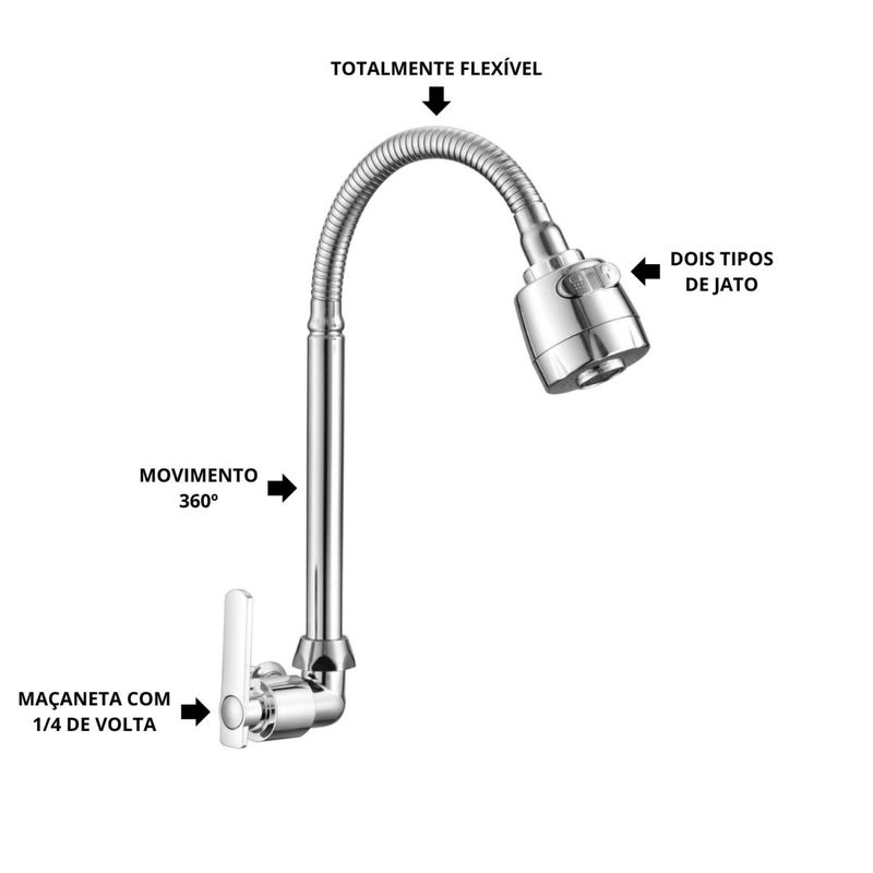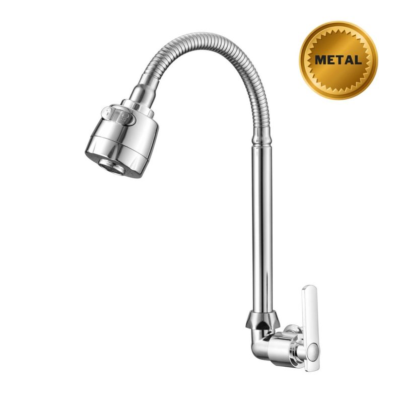 Lux Torneira de Parede Flexível para Cozinha com 2 Jatos e Fechamento 1/4 Volta Cromado - Torneira de Parede Flexível para Cozinha Características Gerais do Produto: • Acabamento: cromada: Proporciona um visual elegante e atemporal que combina com decorações modernas. • Acionamento: Fechamento 1/4 volta: Permite abertura e fechamento rápidos com um quarto de giro, reduzindo o desperdício de água e facilitando o uso diário. • Bica: Flexível (360°). A flexibilidade total permite direcionar a água para qualquer canto da pia, facilitando a limpeza e o enxágue de louças e alimentos. • Instalação: Parede. Uma instalação de parede economiza espaço na bancada e confere um visual mais moderno e limpo ao ambiente. • Jato: 2 tipos de jato (concentrado e ducha): Oferece versatilidade para tarefas como enxaguar louças ou vegetais, melhorando a usabilidade e atendendo necessidades variadas. • Material: Corpo em metal e bico em ABS. A combinação de metal garante durabilidade e resistência à corrosão, enquanto o ABS (Acrilonitrila Butadieno Estireno) no bico proporciona flexibilidade e leveza, oferecendo o melhor dos dois mundos: robustez e usabilidade. Acompanha o produto: • 1 x Lux Torneira de Parede Flexível para Cozinha com 2 Jatos e Fechamento 1/4 Volta Garantia: • 7 dias de garantia