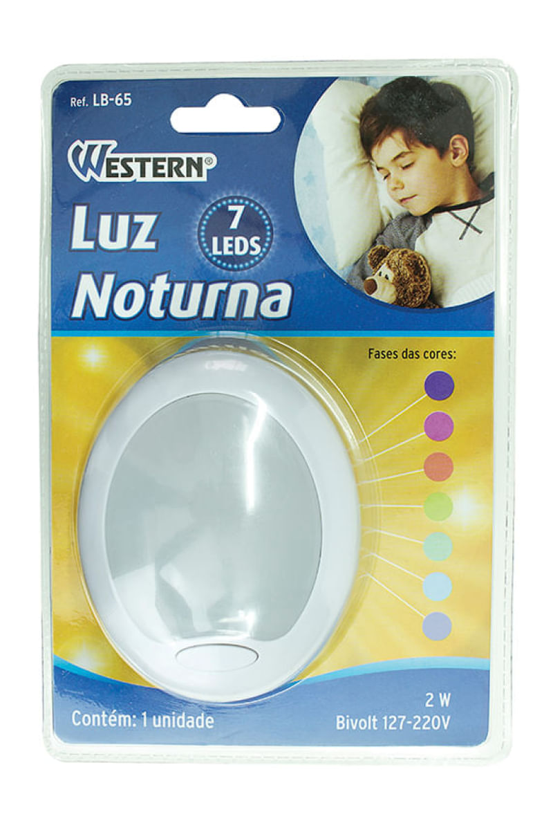 LUZ NOTURNA 7LEDS - Dimensões da peça: 9,8 x 8 x 7,7cm - Dimensões da embalagem: 21,3 x 14,5 x 7,7cm - Quantidade Inter: 25 Peças - Dimensões Inter:50 x 29,1 x 20cm - Quantidade Master: 50 Peças - Dimensões Master: 52 x 43 x 31cm - Material: ABS, PS - Cor: Branca - Tipo de Embalagem: Blister - Marca: Western - Origem: China - Contém - 1 unidade - Potência máxima: 2W - Tensão 127 – 220V Bivolt - Frequência: 60Hz - Características: - Ideal para iluminação de quartos - Com duas formas de iluminação contínua e rotativa de cores Instruções: - Aperte o botão esquerdo on/off para ligar e desligar - Aperte o botão direito play/pause para acionar a mudança de cores - Cuidados. - LEDS são brilhantes. Nunca olhe diretamente para a luz, não aponte a luminária para os olhos de outras pessoas, pois isto pode prejudicar a visão (crianças devem ser advertidas por adultos). - Guarde o aparelho em local seco fresco e ao abrigo do sol. - Não utilize o aparelho em ambiente eGarantia do produto: 90 dias de garantia de acordo com o Código de Defesa do Consumidor + a Garantia do Fabricante