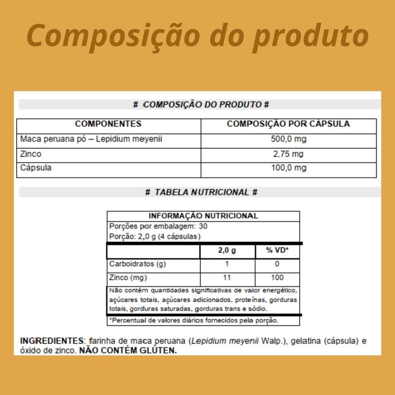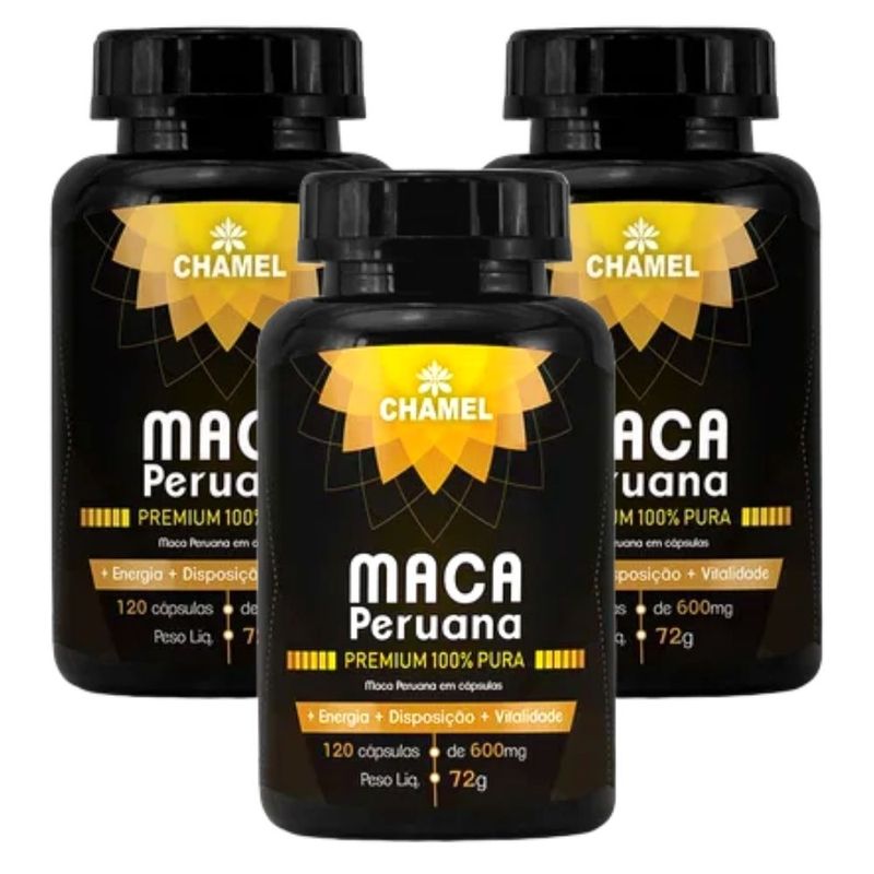Maca Peruana 100% pura em cápsulas. Marca: Chamel Apresentação: 3 frascos com 120 cápsulas Recomendação de consumo: 4 cápsulas ao dia. Registro MS: 6.2613.0062 Composição por cápsula: Maca peruana (Lepidium meyenii) 500,0 mg Zinco 2,75 mg Cápsula 100,0 mg Porções por embalagem: 30 Porção/; 2,0g (4 cápsulas) A Maca peruana (Lepidium meyenii) é uma planta Andina com origem no Peru (Cordilheira dos Andes) que se desenvolve em altitudes de até 4500 metros e têm despertado o interesse dos brasileiros. A parte usada é o tubérculo suculento (tipo uma batata) com formato que lembra o nabo ou rabanete. A batata ou raiz de maca peruana é a parte mais consumida no Peru que utiliza na forma crua, cozida e desidratada. No Brasil, geralmente a sua farinha é consumida na forma de cápsulas pela sua praticidade. Em sua composição nutritiva, ela apresenta ainda aminoácidos, ácidos graxos, vitaminas e minerais como potássio, cálcio, ferro, cobre, zinco e manganês. Sobre a CHAMEL - Controle de Qualidade: 25 anos trabalhando com qualidade. A CHAMEL conta com laboratórios equipados para o Controle de Qualidade de todos os insumos recebidos e utilizados pelo setor industrial. O controle de qualidade tem por objetivo avaliar as características físicas, químicas e microbiológicas das matérias-primas e produtos acabados. Dessa forma, a conformidade dos padrões de qualidade especificados pelas farmacopeias e atos normativos deve ser vista como um requisito necessário para a garantia da qualidade, segurança e eficácia dos produtos fabricados na indústria.