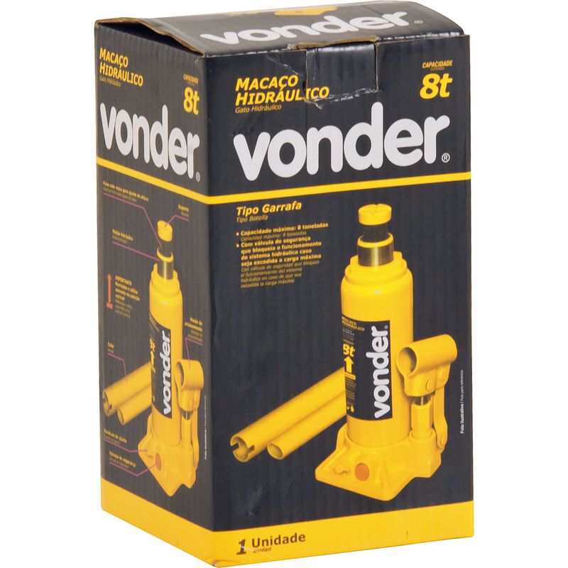 Macaco Hidráulico Garrafa 8 Toneladas 1 Estágio VonderO Macaco Hidráulico Garrafa de 8 toneladas da Vonder é a ferramenta ideal para quem busca eficiência e segurança na elevação de veículos e cargas pesadas. Com uma capacidade de carga impressionante de 8 toneladas, este macaco é perfeito para uso em oficinas mecânicas, garagens e até mesmo em situações de emergência na estrada. A Vonder é uma marca reconhecida pela qualidade e durabilidade de seus produtos, garantindo que você tenha um equipamento confiável em mãos.Este macaco hidráulico possui uma altura mínima de levantamento de 230 mm e uma altura máxima de 457 mm, permitindo uma ampla gama de aplicações. O fuso de elevação com rosca proporciona maior elevação e facilita o ajuste no momento da aplicação, enquanto a válvula de segurança evita elevações superiores à capacidade, garantindo a segurança do usuário. Além disso, o cabo dividido em duas partes facilita o armazenamento e transporte do equipamento.Para garantir o uso seguro e prolongado do seu macaco hidráulico, é importante seguir algumas instruções de uso. Sempre utilize, armazene e transporte o macaco na posição vertical para evitar vazamento de óleo. A quantidade total de óleo hidráulico é de 210 ml, e é recomendável verificar regularmente o nível de óleo e realizar a manutenção conforme necessário.ESPECIFICAÇÕES TÉCNICAS:- Marca: Vonder- Código universal de produto: 7893946023836- Máxima altura de levantamento: 457 mm- Peso máximo suportado: 8 t- Mínima altura de levantamento: 230 mm- Modelo: 8 toneladas 1 estágio- Formato do macaco: Garrafa- Curso do pistão: 147 mm- Curso do fuso: 80 mm- Diâmetro do fuso: 35 mm- Dimensões da base: 120 mm x 118 mmITENS INCLUSOS:- 1 Macaco hidráulico tipo garrafa- 1 Cabo de acionamentoGARANTIA:Este produto possui uma garantia de 6 meses. Para mais informações sobre a cobertura da garantia e como acioná-la, consulte o manual do produto ou entre em contato com o suporte técnico da Vonder.Adquira já o seu Macaco Hidráulico Garrafa 8 Toneladas Vonder e garanta segurança e eficiência na elevação de veículos e cargas pesadas. Não perca a oportunidade de ter um equipamento de alta qualidade e durabilidade em sua oficina ou garagem!