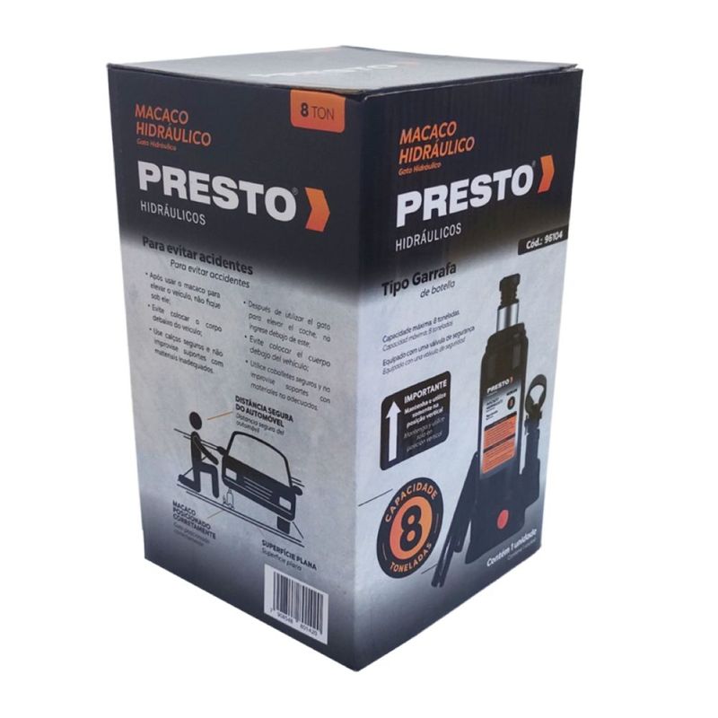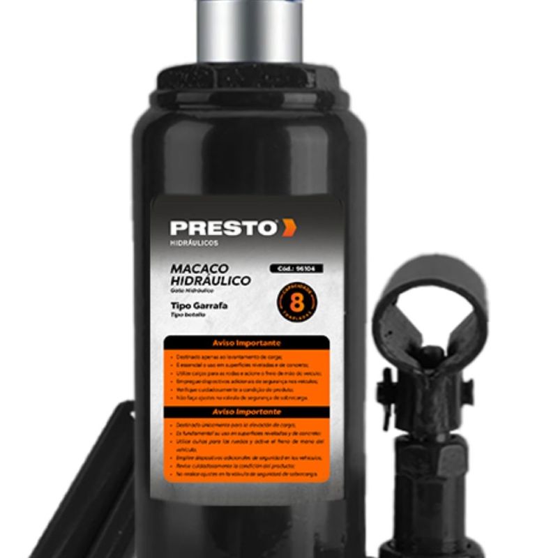 Código do Fornecedor: 96104 Marca: Presto Conteúdo da embalagem: 1 Macaco Hidráulico Garrafa 8 Toneladas Presto Especificações do Produto: Largura: 115 mmAltura: 200 mmProfundidade: 115 mmPeso: 4,50 kgCarga máxima: 8.000 kgDescrição:O Macaco Hidráulico Tipo Garrafa 8 toneladas da Presto é ideal para quem precisa levantar veículos com segurança e eficiência. Compacto e robusto, este macaco é essencial para oficinas mecânicas, borracharias e garagens, oferecendo uma solução confiável para diversas aplicações automotivas e industriais. Fabricado em aço de alta resistência, garante durabilidade e confiabilidade em condições de trabalho intensas. O sistema hidráulico proporciona uma elevação suave e controlada, e a alavanca ergonômica facilita o manuseio, tornando o processo mais eficiente e menos cansativo. O macaco é equipado com uma válvula de segurança que previne sobrecarga, assegurando proteção tanto para o equipamento quanto para o operador. A base estável oferece maior segurança durante a operação, evitando acidentes e garantindo a estabilidade do veículo ou carga durante a elevação. Vantagens:Capacidade de carga de 8 toneladas (8.000 kg)Fabricado em aço de alta resistênciaSistema hidráulico eficiente e fácil de operarEquipado com válvula de segurançaBase estável para segurança adicionalDesign compacto e robusto Garantia: 12 mesesImagens meramente ilustrativas de responsabilidade do fornecedor