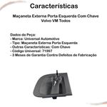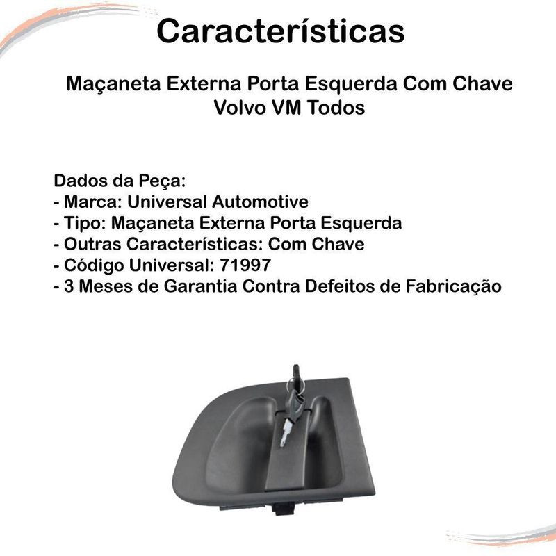 Maçaneta Externa Porta Esquerda Com Chave Volvo Vm TodosCONTEÚDO DA EMBALAGEM- 01 Maçaneta Externa Da Porta Esquerda Com ChaveVEÍCULOS APLICÁVEISVOLVO:- VM Todos os anosIDENTIFICAÇÃO DO PRODUTOMarca: UniversalCódigo Universal do Produto (EAN): 7895272719971Código IPI: 87082999Código NCM: 8871SKU Universal: 71997Garantia do Fabricante: 3 Meses contra defeitos de fabricaçãoInstalação:Este é um produto técnico e deve ser aplicado por um profissional, assim se garantia a longa vida útil do mesmo.HistóriaA Shoppeças é uma empresa especializada em E-COMMERCE, e disponibilizamos um portfólio de mais de 30 mil itens no setor Automotivo, nos segmentos de ferragens automotivas (fechaduras, maçanetas, cilindros, trincos de quebra vento), máquinas do vidro elétricas e manuais, tampas automotivas, borrachas de vedação, linha de suspensão e direção, amortecedores mola a gás, acessórios automotivos e palhetas. Todos com portfólio completo para linha leve, pesada, pick-ups e vans.EnviosRealizamos todos os nossos envios em até 24 horas após o faturamento.Fiat