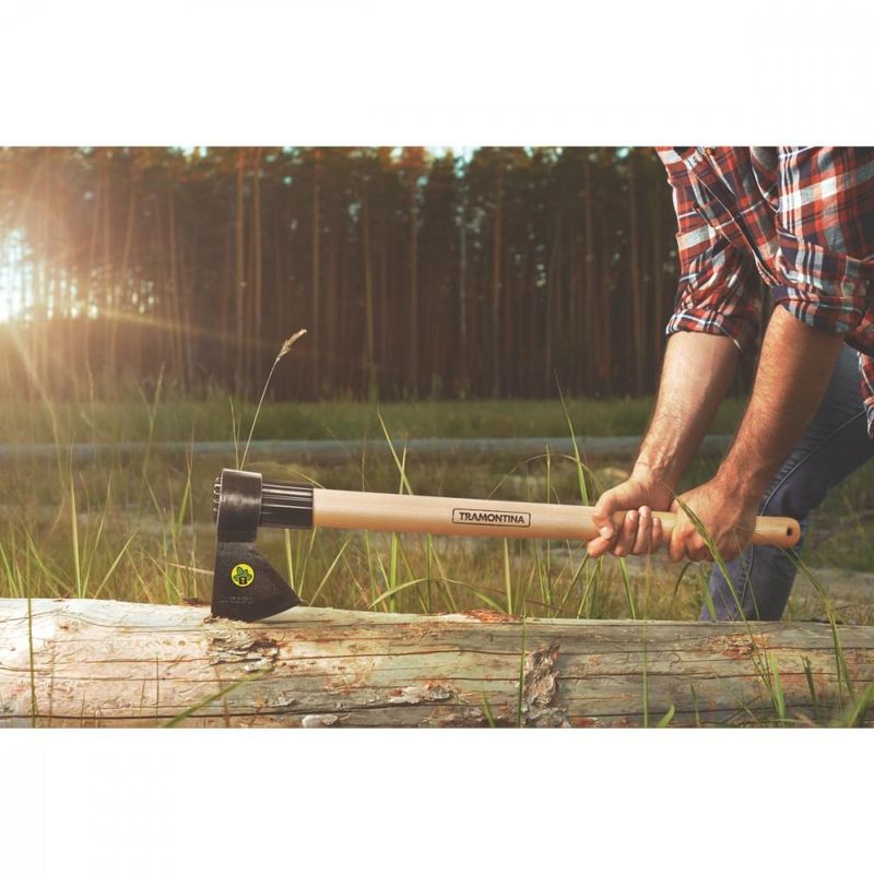 Machado Soldado com Cabeça Redonda Tramontina Tamanho 2 em Aço com Cabo de Madeira 50 cm O machado soldado com cabeça redonda Tramontina tamanho 2 em aço com cabo de madeira 50 cm ajuda você a cortar madeira de forma mais prática e segura. Produzido com lâmina em aço carbono temperado, ele proporciona mais resistência e durabilidade do fio. Recebe ainda pintura eletrostática a pó, que protege contra oxidação. Possui olho oval de 38x68 milímetros e cabo de 50 centímetros. Em madeira de origem renovável, o cabo recebe acabamento envernizado e é produzido com sistema de encabamento com bucha plástica, característica que absorve melhor o impacto tornando o uso mais confortável e firme. Uma peça com toda a qualidade das ferramentas Tramontina. - O machado é temperado em todo o corpo da peça, proporcionando maior resistência e menor desgaste durante o uso.- Fabricado em aço carbono especial forjado de alta qualidade.- A lâmina possui tamanho 2 e sua afiação é feita em máquinas automatizadas, proporcionando excelente durabilidade do fio.- Recebe pintura eletrostática a pó, que tem uma melhor apresentação visual e maior proteção contra oxidação.- A tinta utilizada na pintura é isenta de metais pesados na sua composição, o que minimiza o impacto ambiental.- Possui olho oval de 38 x 68 mm.- O cabo de 50 cm desta ferramenta, além de possuir ótima resistência, é produzido com madeira de origem renovável.- Cabo com acabamento envernizado, para um melhor acabamento e apresentação do produto. A camada protetora em verniz incolor realça sua tonalidade, concedendo brilho e um toque mais liso ao produto.- O sistema de encabamento com bucha plástica proporciona excelente fixação do machado, evitando que os cabos se soltem durante o uso. A bucha absorve a contração da madeira, mantendo o cabo sempre firme, e auxilia na absorção do impacto durante o uso.