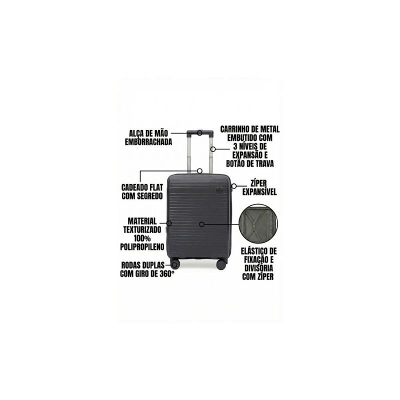 A Mala Pequena de Polipropileno Seanite é a escolha ideal para quem busca leveza, resistência e mobilidade total em viagens curtas. Produzida em polipropileno, material altamente durável, oferece excelente proteção aos seus pertences sem abrir mão da praticidade. As rodas duplas com giro 360° garantem deslocamento suave e estabilidade em qualquer ambiente, como aeroportos, rodoviárias e hotéis.Com design básico clássico e acabamento moderno, essa mala une funcionalidade, segurança e estilo. Conta com fechamento em zíper com cadeado, compartimento interno com divisórias e bolso interno, facilitando a organização dos itens durante a viagem. Perfeita para uso no dia a dia ou escapadas de fim de semana, integra a coleção Verão 2026.• Marca: Seanite• Coleção: Verão 2026• Cor: Preto• Material: Polipropileno• Estrutura rígida, leve e resistente• Rodas duplas com giro 360°• Fechamento em zíper com cadeado• Bolso interno e divisórias para melhor organização• Estilo básico clássico• Indicado para viagens curtas• Grupo: Malas para Viagem• Subgrupo: Mala Pequena (P)Medidas aproximadas:• Altura: 56 cm• Largura: 23 cm• Comprimento: 36 cm• Peso: 2,615 kg