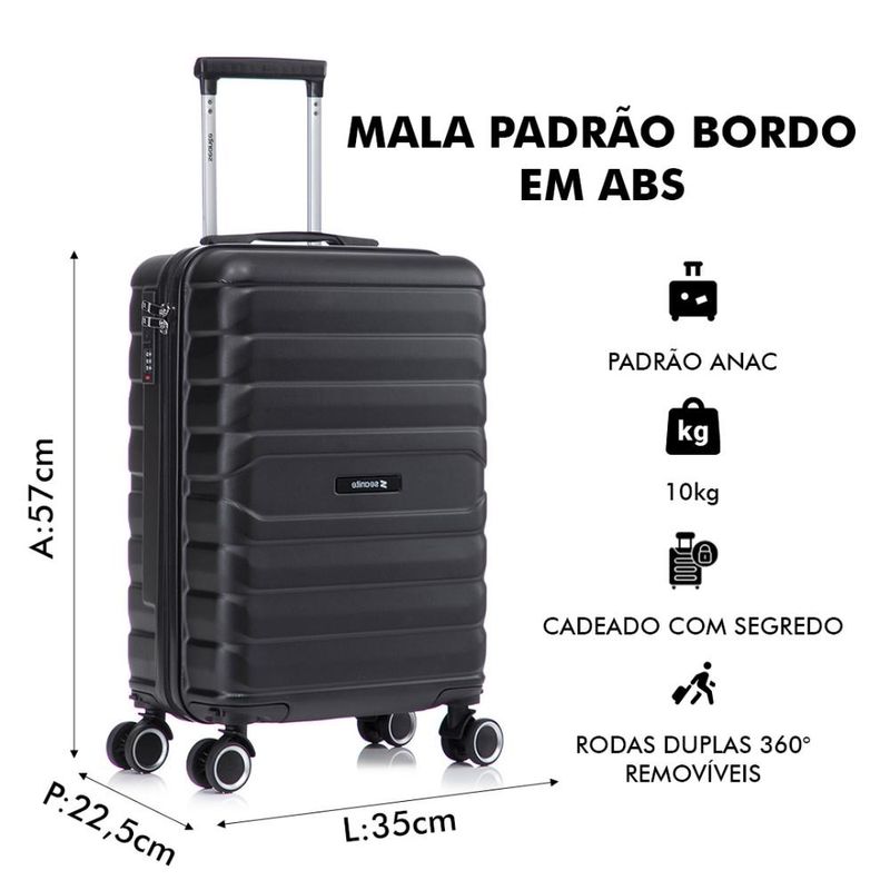 A mala de viagem padrão bordo 10kg com cadeado e rodas duplas oferece a combinação perfeita de praticidade, resistência e design moderno para viagens curtas. Produzida em ABS 100% texturizado, garante leveza e proteção contra impactos, ideal para uso como bagagem de bordo. Com rodas duplas, carrinho ajustável e cadeado embutido, essa mala assegura um transporte confortável, estável e seguro, atendendo perfeitamente às necessidades de quem viaja com frequência.Especificações Técnicas:Modelo: Mala de Viagem Padrão SKU 91124.Material: 100% ABS texturizado.Rodas: 4 rodas duplas removíveis com giro 360°.Segurança: Cadeado fixo com segredo numérico.Carrinho: Metal embutido com botão de trava e ajuste de altura.Alças: Alça de mão emborrachada.Organização Interna: Forro personalizado, divisória com zíper, elástico de fixação.Dimensões e Logística:Tamanho: 20” (P – bordo), 10kg padrão bordo ANAC.Medidas: 35 cm (Largura) x 57 cm (Altura) x 22,5 cm (Profundidade).Cores Disponíveis: Preto, Rosa e Prata.