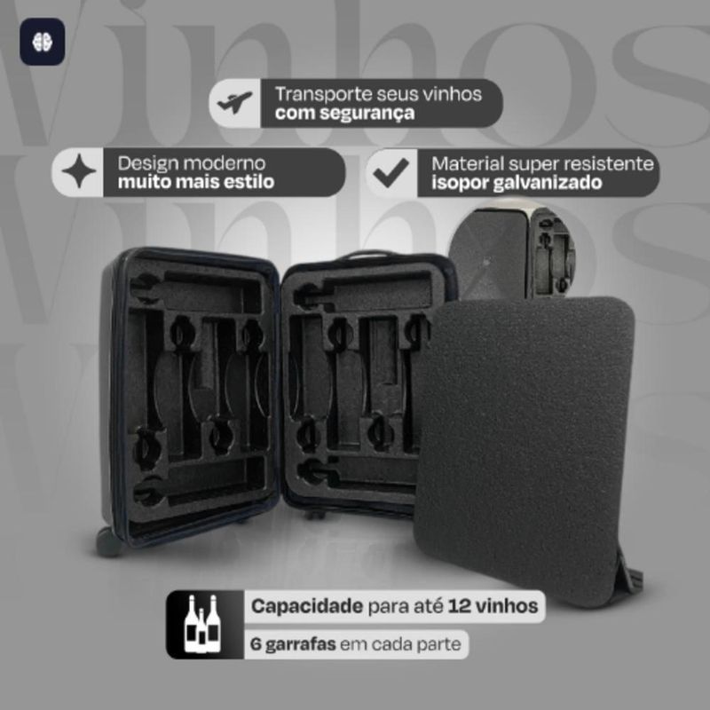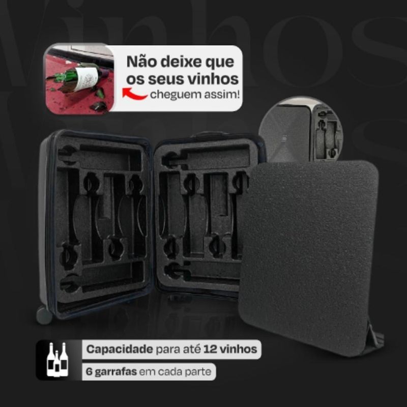 Mala Viagem Transporte De Vinho 12 Garrafas Grande Colmeia Espuma 12 Espumantes Winebag Proteçao MaximaMala para Vinhos com Colmeia – Proteção, Sofisticação e PraticidadeProjetada para transportar até 12 garrafas, essa mala é a escolha ideal para apreciadores de vinho que buscam segurança e eficiência no transporte.Destaques do Produto? Proteção Máxima: Colmeia de EPP (polipropileno expandido), resistente e reciclável, garantindo segurança contra impactos. ? Mobilidade Total: Rodinhas duplas 360º, proporcionando um deslocamento suave e sem esforço.? Design Sofisticado: Combina durabilidade e elegância, perfeita para viagens curtas ou longas.Detalhes Técnicos da Mala- Material: Polipropileno de alta qualidade, leve e resistente.- Mobilidade: 4 rodas duplas com giro 360º.- Alça: Retrátil ajustável em alumínio.- Capacidade: Aproximadamente 12 garrafas.- Peso: 5,5 kg.- Dimensões: 74 cm (Altura) x 48 cm (Largura) x 13 cm (Profundidade).Detalhes Técnicos da Colmeia- Material: EPP (polipropileno expandido), reciclável e altamente resistente.- Capacidade: Armazena 12 garrafas de até 900 ml com total segurança.- Dimensões: 47 cm (Altura) x 67 cm (Largura) x 10 cm (Profundidade).Garanta agora sua Mala para Vinhos com Colmeia e transporte seus vinhos com total segurança e praticidade!Mala para Vinhos com Colmeia – Proteção, Sofisticação e PraticidadeProjetada para transportar até 12 garrafas, essa mala é a escolha ideal para apreciadores de vinho que buscam segurança e eficiência no transporte.Destaques do Produto? Proteção Máxima: Colmeia de EPP (polipropileno expandido), resistente e reciclável, garantindo segurança contra impactos. ? Mobilidade Total: Rodinhas duplas 360º, proporcionando um deslocamento suave e sem esforço.? Design Sofisticado: Combina durabilidade e elegância, perfeita para viagens curtas ou longas.Detalhes Técnicos da Mala- Material: Polipropileno de alta qualidade, leve e resistente.- Mobilidade: 4 rodas duplas com giro 360º.- Alça: Retrátil ajustável em alumínio.- Capacidade: Aproximadamente 12 garrafas.- Peso: 5,5 kg.- Dimensões: 74 cm (Altura) x 48 cm (Largura) x 13 cm (Profundidade).Detalhes Técnicos da Colmeia- Material: EPP (polipropileno expandido), reciclável e altamente resistente.- Capacidade: Armazena 12 garrafas de até 900 ml com total segurança.- Dimensões: 47 cm (Altura) x 67 cm (Largura) x 10 cm (Profundidade).Garanta agora sua Mala para Vinhos com Colmeia e transporte seus vinhos com total segurança e praticidade!