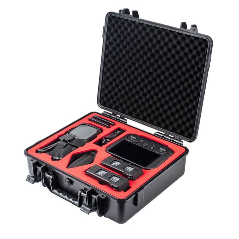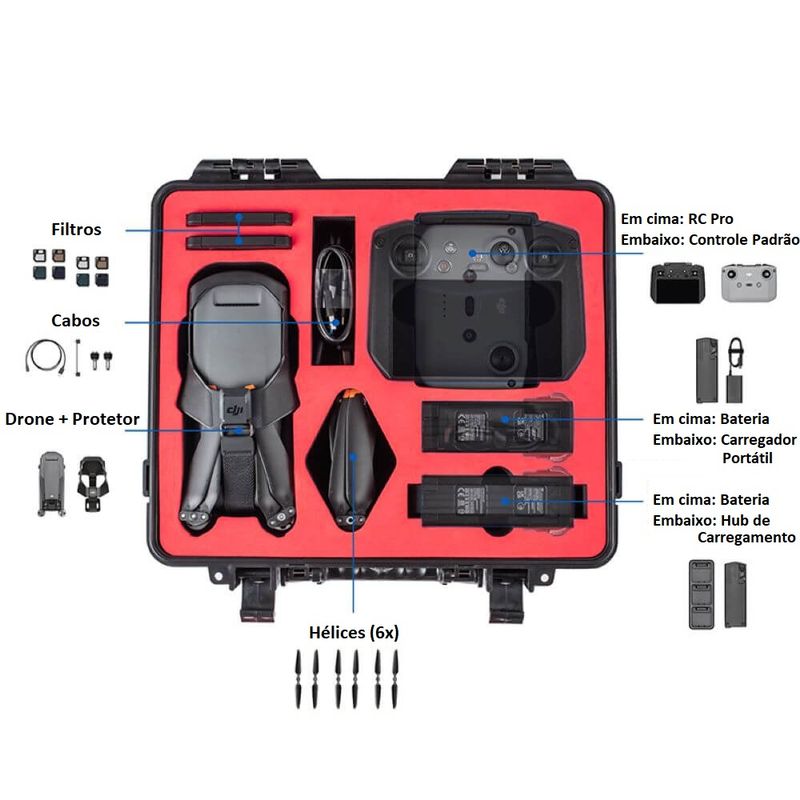 Para acompanhar você em qualquer aventura com seu Mavic 3, é preciso um estojo que consiga acomodar o Drone e diversos acessórios com total segurança e praticidade. Pensando nisso, esta maleta estanque da marca StartRC foi desenvolvida para atender as necessidades de uso de pilotos exigentes, que buscam um produto de qualidade para proteger seu equipamento.Ela possui excelente espaço interno para você armazenar tudo o que precisar (versão Mavic 3 Fly More Combo ou Mavic 3 Cine Premium Combo). Nele é possível colocar o Drone, 3 baterias (a do drone + 2 extras), o controle remoto inteligente ou versão padrão, cabos, carregador portátil, hub de carregamento, hélices e outros acessórios. O case conta com exterior fabricado em material rígido e altamente durável, sendo resistente e seguro para levar em qualquer situação. Protege seu equipamento contra arranhões, quedas, sujeira, água e muito mais. O interior possui espaço de armazenamento ideal para acomodar com precisão o drone e seus acessórios, com compartimentos moldados em espuma de EVA, especificamente para cada item. Desse modo, seu Drone permanece devidamente preso e encaixado, sem correr o risco de ficar soltando com o movimento da maleta.A parte da tampa possui uma espuma que evita o contato direto da parte rígida com os equipamentos, evitando que fique forçando e danificando os acessórios enquanto estiver fechada. As travas possuem fácil abertura e travamento, com excelente qualidade e durabilidade. Possui ainda encaixe para cadeados, alça de mão confortável e ergonômica, além de uma válvula de equilíbrio de pressão impermeável e respirável, que equilibra as mudanças de altitude e temperatura causadas pelas diferenças entre as pressões internas e externas.Especificações Técnicas:Marca: StartRCModelo: 1110290Material: ABS + EVACor: Preto (exterior) + Vermelho (interior)Dimensões Externas Aprox.: 39,8 x 36,8 x 13,5cm (C x L x A)Peso: 2,45kgCompatibilidade:Este produto é compatível somente com o Drone DJI Mavic 3 Fly More Combo ou Mavic 3 Cine Premium Combo.Garantia:Garantia de 90 dias para defeito de fabricação.Itens Inclusos:1 x Maleta Estanque para DJI Mavic 3Observações:Não acompanham Drone, Controle e demais acessórios.Imagens meramente ilustrativas.