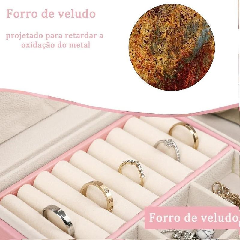 Maleta Porta Joias Organizador Com Gaveta 2 Andares Para Brincos Aneis Pulseiras Relogio Viagem RosaMaleta Porta-Joias com Design Elegante e Funcionalidade Premium Mantenha suas joias organizadas e protegidas com estilo. A Maleta Porta-Joias combina sofisticação e praticidade em um design que vai encantar qualquer amante de acessórios. Seja em casa ou em viagens, suas joias estarão sempre ao alcance, protegidas e organizadas de forma impecável.Design Refinado e Durabilidade Excepcional Feita com couro sintético de alta qualidade, esta maleta não é apenas um item funcional, mas também uma peça de decoração. O acabamento premium confere um toque de elegância, enquanto o forro de veludo macio protege suas joias contra poeira, arranhões e impressões digitais, preservando seu brilho por muito mais tempo.Organização Inteligente para Suas Joias Com dois níveis de armazenamento e compartimentos versáteis, esta maleta foi projetada para acomodar todos os seus itens, desde colares e pulseiras até anéis e brincos. Os 6 ganchos na tampa são ideais para colares e pingentes, evitando que eles se embolem e permitindo fácil acesso.Portabilidade e Praticidade Compacta e leve, a maleta mede 23 x 17 x 9 cm, sendo perfeita para viagens. Leve suas joias favoritas com você para qualquer lugar, sabendo que estarão seguras e organizadas. Além disso, o material resistente à água e fácil de limpar garante que a maleta continue sempre com aparência de nova.Presente que Encanta Seja para uma ocasião especial ou para demonstrar carinho no dia a dia, esta Maleta Porta-Joias é a escolha ideal. Um presente sofisticado para esposas, namoradas, mães, filhas ou amigas que adoram manter suas joias bem cuidadas e organizadas.Invista na combinação perfeita de estilo, proteção e organização para suas joias com esta maleta premium! Essa descrição foca em atrair um público que valoriza a combinação de estilo e funcionalidade, utilizando uma linguagem que enfatiza os benefícios emocionais e práticos do produto.Maleta Porta-Joias com Design Elegante e Funcionalidade Premium Mantenha suas joias organizadas e protegidas com estilo. A Maleta Porta-Joias combina sofisticação e praticidade em um design que vai encantar qualquer amante de acessórios. Seja em casa ou em viagens, suas joias estarão sempre ao alcance, protegidas e organizadas de forma impecável.Design Refinado e Durabilidade Excepcional Feita com couro sintético de alta qualidade, esta maleta não é apenas um item funcional, mas também uma peça de decoração. O acabamento premium confere um toque de elegância, enquanto o forro de veludo macio protege suas joias contra poeira, arranhões e impressões digitais, preservando seu brilho por muito mais tempo.Organização Inteligente para Suas Joias Com dois níveis de armazenamento e compartimentos versáteis, esta maleta foi projetada para acomodar todos os seus itens, desde colares e pulseiras até anéis e brincos. Os 6 ganchos na tampa são ideais para colares e pingentes, evitando que eles se embolem e permitindo fácil acesso.Portabilidade e Praticidade Compacta e leve, a maleta mede 23 x 17 x 9 cm, sendo perfeita para viagens. Leve suas joias favoritas com você para qualquer lugar, sabendo que estarão seguras e organizadas. Além disso, o material resistente à água e fácil de limpar garante que a maleta continue sempre com aparência de nova.Presente que Encanta Seja para uma ocasião especial ou para demonstrar carinho no dia a dia, esta Maleta Porta-Joias é a escolha ideal. Um presente sofisticado para esposas, namoradas, mães, filhas ou amigas que adoram manter suas joias bem cuidadas e organizadas.Invista na combinação perfeita de estilo, proteção e organização para suas joias com esta maleta premium! Essa descrição foca em atrair um público que valoriza a combinação de estilo e funcionalidade, utilizando uma linguagem que enfatiza os benefícios emocionais e práticos do produto.
