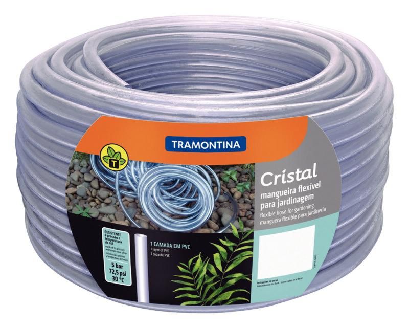 Mangueira Cristal Tramontina em PVC 1 Camada 50 m Se você pensa em utilizar uma mangueira leve e de qualidade para lavar sua calçada ou garagem, a Mangueira Cristal Tramontina em PVC 1 Camada 50 m é a ferramenta ideal para este tipo de atividade. Produzida em PVC, a peça é prática e atinge até os lugares mais difíceis do seu quintal. Devido a sua transparência é possível ver o percurso da água através dela, mas é aconselhável não deixá-la muito tempo sob o sol para ter maior durabilidade. Resistência e praticidade é com a Tramontina! Informações Gerais: - Mangueira flexível e de fácil manuseio.- Possui 50 metros de comprimento.- Recomendada para situações de uso com pressão da água de até 5 bar [72,5 psi] e temperatura de 30 °C.- Possui 1 camada em PVC. Uso seguro e adequado: - A mangueira é recomendada para uso doméstico ou profissional na jardinagem, agricultura ou construção civil, em situações com pressão da água de até 5 bar [72,5 psi].- Para aumentar a durabilidade da mangueira, não deixá-la exposta ao sol após o uso.- A temperatura máxima de trabalho da água deve ser 30 °C.- Use o enrolador de mangueira Tramontina para guardar a mangueira.- As metragens a partir de 50 metros destinam-se à venda de metro em metro, sendo recomendado o uso de expositores para esse fim.- Para descarte dos produtos e embalagens siga as orientações de reciclagem vigentes. Garantia: 90 dias de garantia legal para vícios ou defeitos de fabricação.