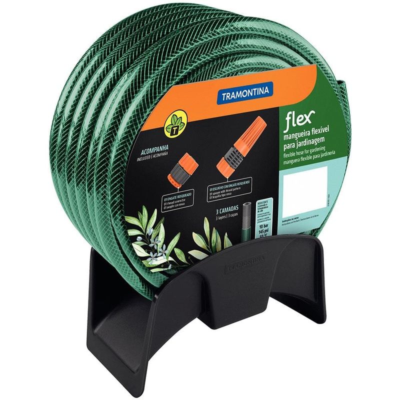 A Mangueira Especial Flex possui 3 camadas distintas: a camada interna em PVC, a intermediária em poliéster trançado e a externa em PVC.Ela acompanha jogo com engate rosqueado e esguicho.