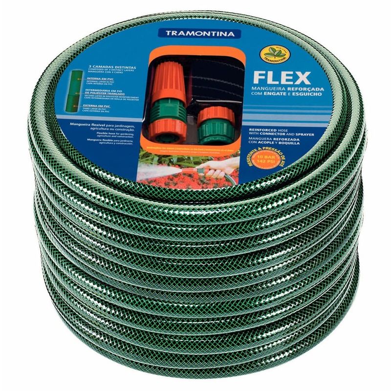 A Mangueira Tramontina Flex, de 25 metros, agrega eficiência e qualidade ao seu trabalho, facilitando a sua vida.Além de vir acompanhada de engates rosqueados e esguicho, ela tem três camadas distintas: interna em PVC, intermediária em poliéster trançado e a externa também em PVC. Produto com a qualidade Tramontina que você conhece!