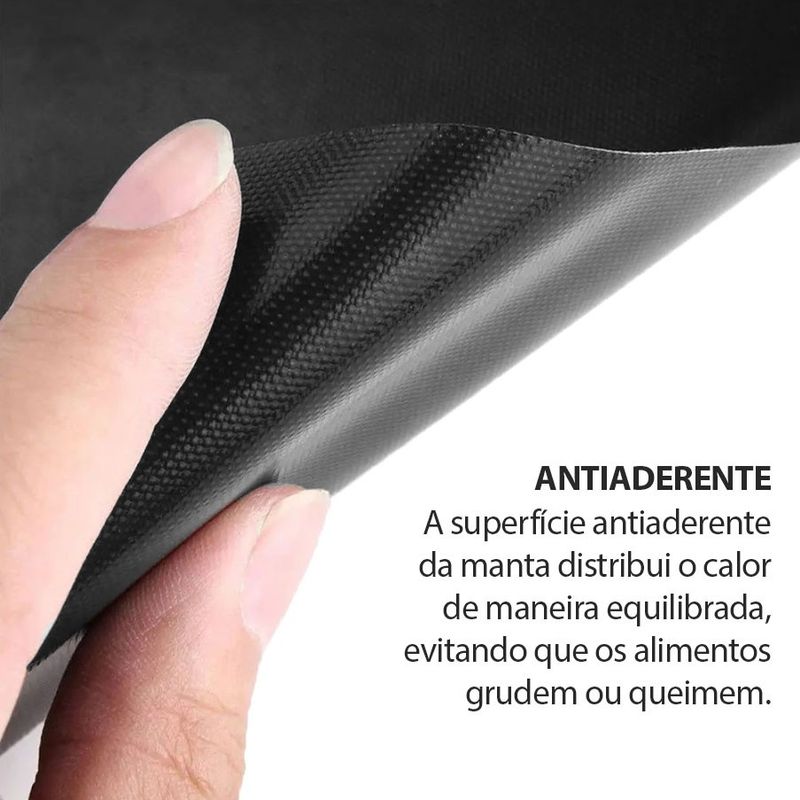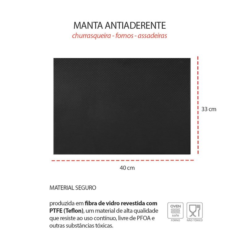 Manta antiaderente para grelha de churrasqueira, fornos ou assadeiras. Acompanha tigela bowl e pincel culinario de silicone. A manta funciona como uma chapa, basta colocar sobre a grelha do forno ou churrasqueira que em alguns minutos estara aquecida. A manta Grill é versatil e pode ser utilizada de varias formas, em assadeiras, forno a gas, eletrico ou carvao. Super leve e maleavel, é facil de armazenar e limpar. Reduz a fumaça e evita que os alimentos desmanchem ou grudem. Contem: 1 Manta Antiaderente Medidas: 40 x 33 cm Material: Fibra de vidro com PTFE (Teflon) 1 Tigela Bowl Medidas: 27 x 12 cm 1 Pincel Culinario Medidas: 21 x 4,5 cm Material: Ferro antiaderente, Polipropileno e Silicone