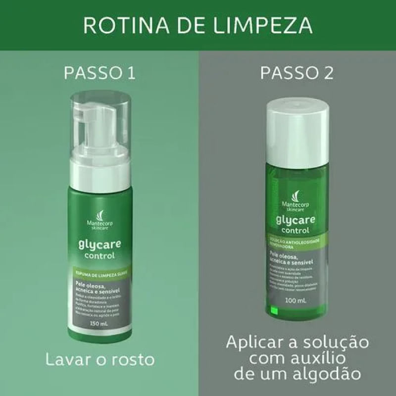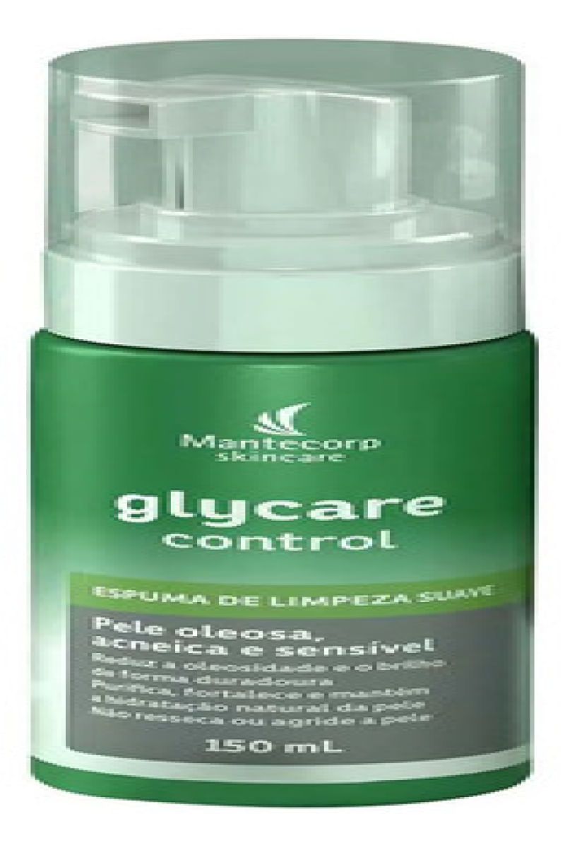 Glycare Control – Espuma de Limpeza Facial 150ml – Mantecorp A Espuma de Limpeza Glycare Control promove uma limpeza suave e eficaz com ação antipoluição, ideal para peles oleosas, acneicas e sensíveis.Remove impurezas, controla o brilho e reduz a oleosidade sem agredir ou ressecar a pele. Conta com Ácido Glicólico, Gluconolactona, PCA de Zinco, Aloe Vera, Acnilys® e Extrato de Hamamelis, que estimulam a renovação celular, equilibram o microbioma e auxiliam na redução de acne e cravos.Mantém o pH fisiológico e hidratação natural da pele, proporcionando toque aveludado e sensação de limpeza. Resultado Limpeza profunda Pele equilibrada, macia e renovada Controle duradouro da oleosidade e brilho Sugestão de Uso Aplicar sobre o rosto úmido. Massagear suavemente. Enxaguar. Usar 2x ao dia ou conforme orientação médica. Itens Inclusos 1 unidade: Mantecorp Glycare Control Espuma de Limpeza Facial 150ml