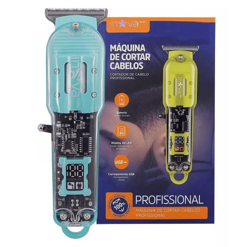 Máquina De Cortar Cabelo Para Barba Masculina Designer Elétrico Profissional Cor:azulMaquina Cortador de Cabelo, Aparador de Pelos e Barbeador Profissional Sem Fio Inova- Modelo espelhado elegante e inovador.- Ultra-silencioso e baixa vibração.- Cortes precisos.- Lâmina de cerâmica com ângulo agudo.- 4 pentes removíveis inclusos.- Livre de fios e cabos.- Botão liga/desliga.- Acompanha cabo carregador USB.? Deixe sua barba sempre aparada e bem feita com o Aparador Profissional Inova.? Ideal para cortar cabelos, barbas e pelos com praticidade de forma rápida e segura.? Com um design moderno e compacto, sendo leve e fácil de manuseá-lo, além de ser sem fio, não irrita sua pele e possui alta precisão. Sua lâmina de cerâmica se mantém afiada e durável, não enferrujando com o tempo, além de um design de borda em forma de evitar cortar acidentalmente a pele.? Cortador com motor de precisão, baixa vibração e design ultra silencioso, e faz com que o processo de preparação muito mais fácil e baixa vibração.? Um produto de excelente qualidade para uso doméstico ou profissional.INFORMAÇÕES TÉCNICAS- Marca: Inova- Modelo: KV-433- Entrada: 100-250V (Bivolt)- Potência: 3W- Saída: 5V DC- Frequência: 50/60Hz- Tempo de Carga: 2 Horas- Tempo de Operação com a Carga Completa: 40-60 Minutos- Material do motor: Aço Inoxidável- Material do cortador: CerâmicaCONTEUDO DA EMBALAGEM- 1 Aparador de Pelos Profissional Inova- 1 Pincel para Limpeza- 1 Cabo Carregador USB- 3 Pentes- 1 Óleo Lubrificante