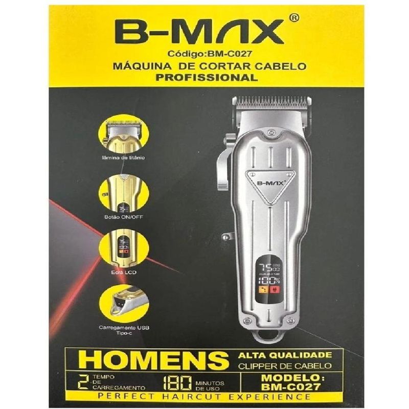 Máquina De Cortar Cabelo Profissional em Metal Cromado C027Chegou a nova e exclusiva máquina B-Max sem fio C027, esta incrível máquina robusta e com um design exclusivo com o corpo totalmente em aço inox agora está disponível para você comprar em território nacional a pronta entrega. Possui led indicativo de carga, saiba quando for necessário colocar a sua Kemei para recarregar!Esta máquina é da marca B-max, uma marca muito promissora que vem fazendo produtos de ótima qualidade e com um preço justo focado no mercado brasileiro, ao adquirir este produto tenha certeza de ter feito um boa aquisição.Informações Técnicas:Acompanha 4 pentes guia tamanhos 3mm/6mm/10mm/13mm, para você já receber e começar a praticar seus cortes !Totalmente recarregável em rede elétrica 110 ou 220v, acompanha a fonte.Tipo de alimentação: bateria Recarregável90 Minutos de carga para 210 minutos de usoPotência: 9WFrequência: 50/60HzMateriais das lâminas: Aço inoxidávelItens Inclusos:1 Máquina B-Max BM-C0271 Fonte 110/220v1 Escova para Limpeza4 Pentes Guia1 Óleo Lubrificante